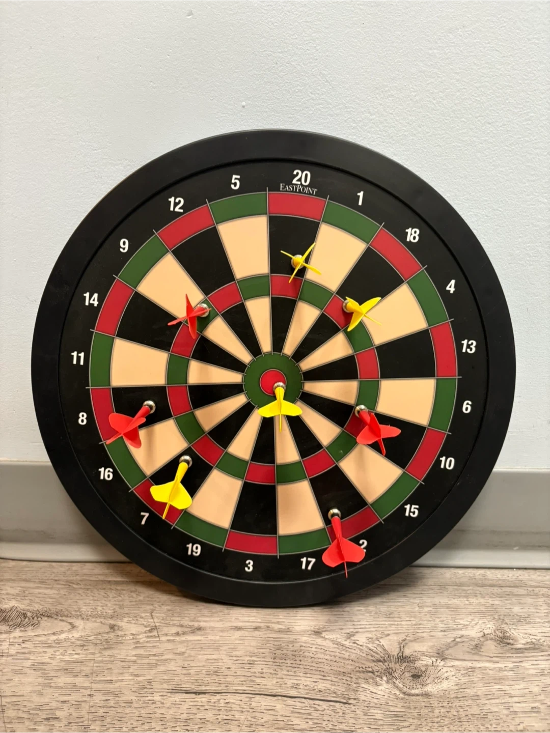 Dartboard with darts for some at-home fun! It's in great shape and ready for a new home. Magnetic no sharp pins. Great for kids.