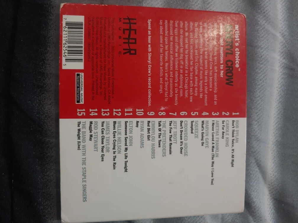 Selling a Sheryl Crow 'Artist's Choice' CD. This CD contains a collection of songs that matter to her, including tracks by Bob Dylan, Carole King, Marvin Gaye, and more. A great addition for any Sheryl Crow fan or music lover!