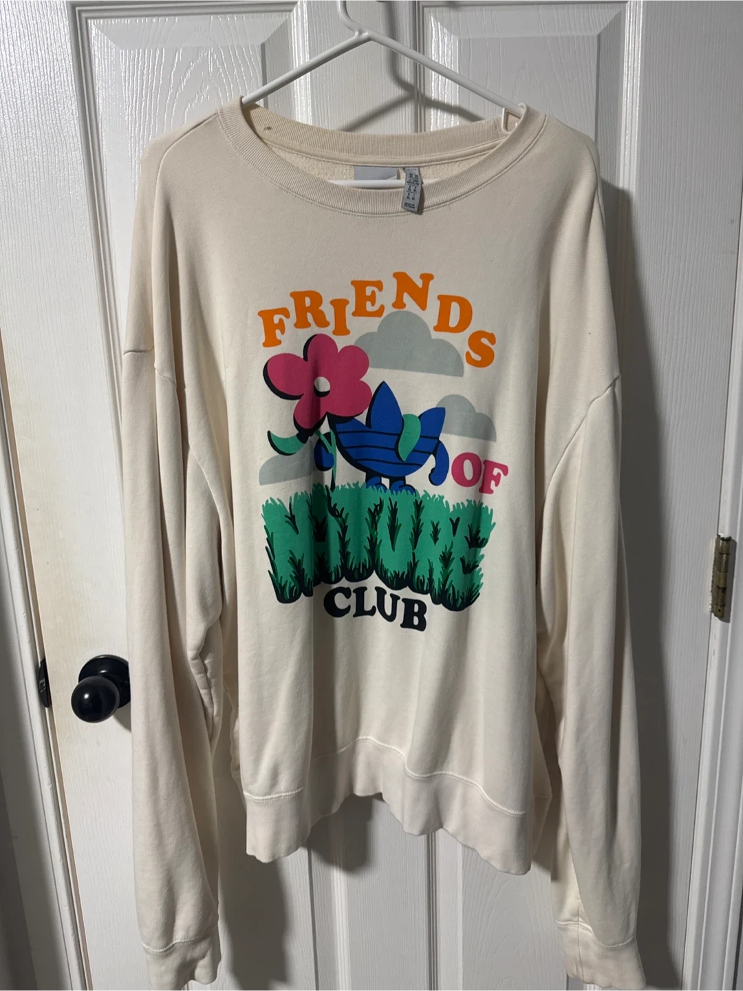 Cozy Adidas sweatshirt with a fun Friends of Nature Club design! It's a cream colour and in great condition.