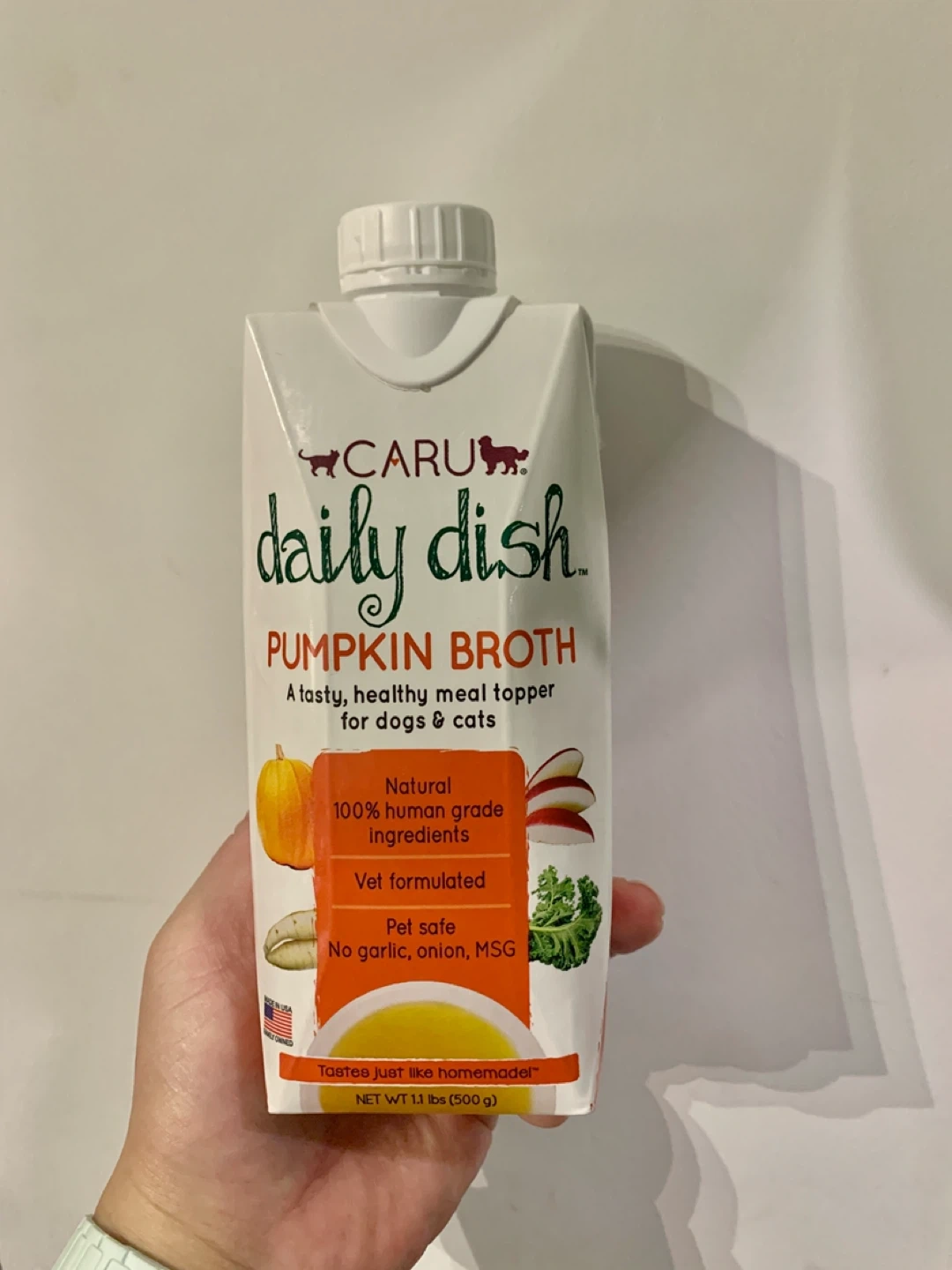 Selling a carton of Caru Daily Dish Pumpkin Broth, a tasty and healthy meal topper for your furry friends! It's vet formulated and safe for pets, with no garlic, onion, or MSG. Tastes just like homemade! - Natural 100% human grade ingredients - Net weight 1.1 lbs (500 g) - Best before August 2526 My cats don’t exactly like pumpkin broth 😒😒🥸🤦🏻♀️ All the money I raise is for me to pay off my overdue vet bills from my cat that passed away this year. (Milo) Selling it cheaper than gogopets, allpets and the pet shop. They all lost for $12.99 to 14.99 —— ‼️NO TRADE‼️✨firm pricing✨ ✨pick up at Wellesley subway station or at my condo building✨will be confirmed in detail