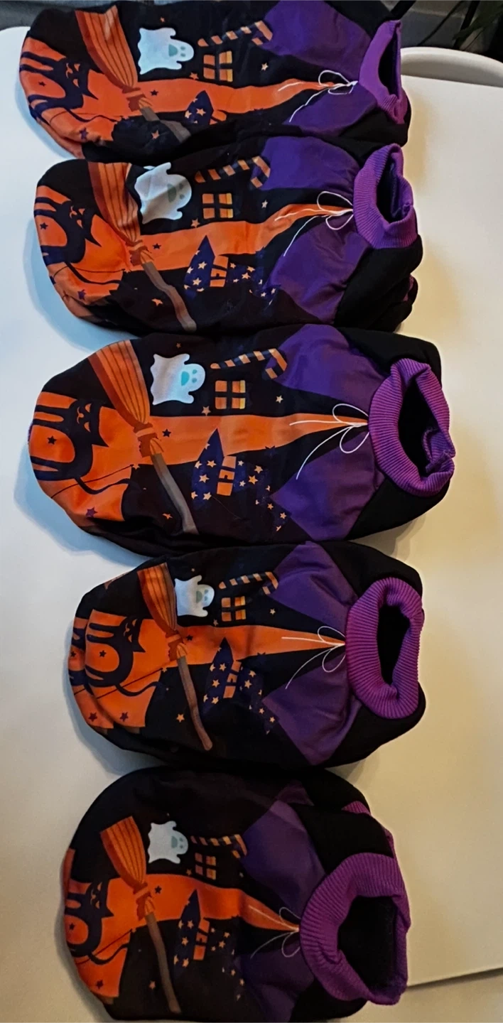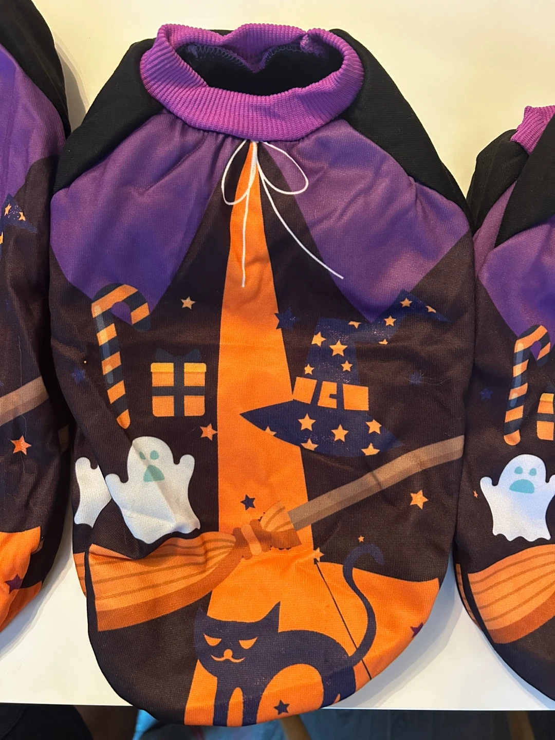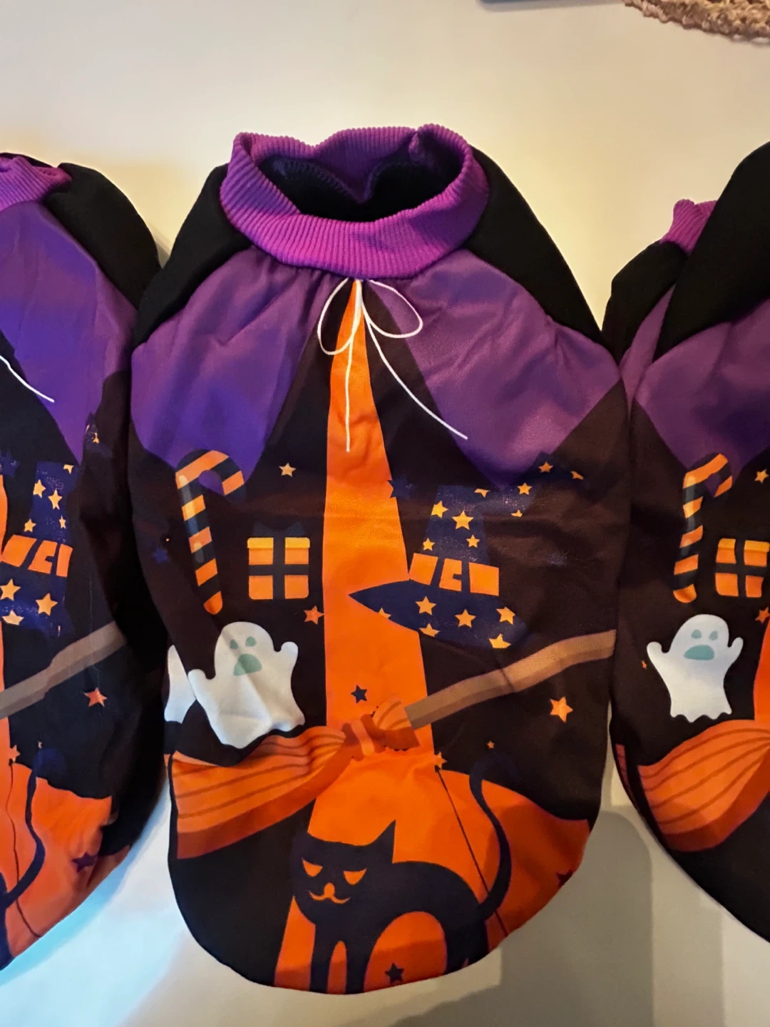 Get your furry friend ready for Halloween with this adorable pet costume! It features a fun and festive design with ghosts, witches, and black cats. Perfect for Halloween parties or trick-or-treating