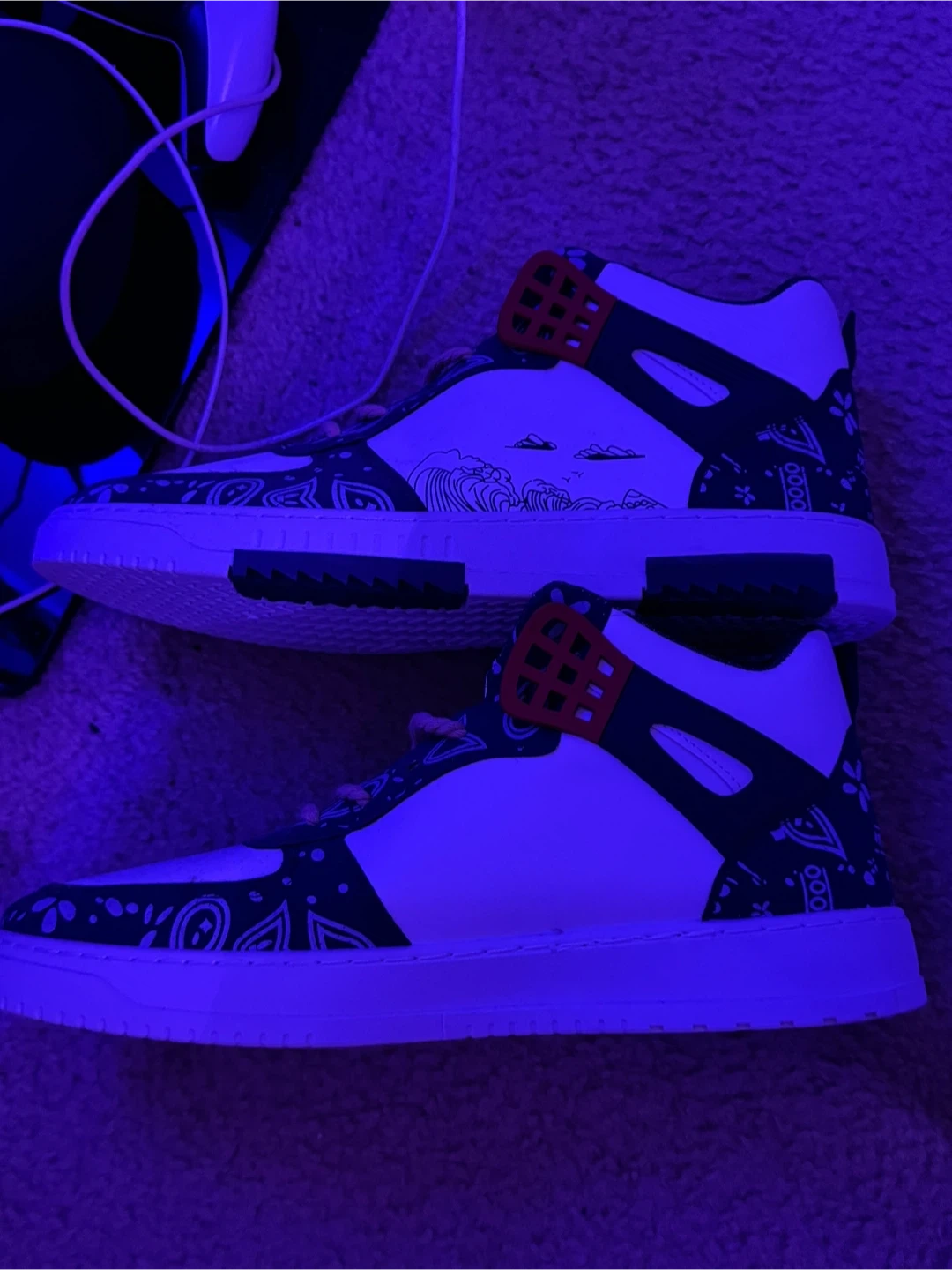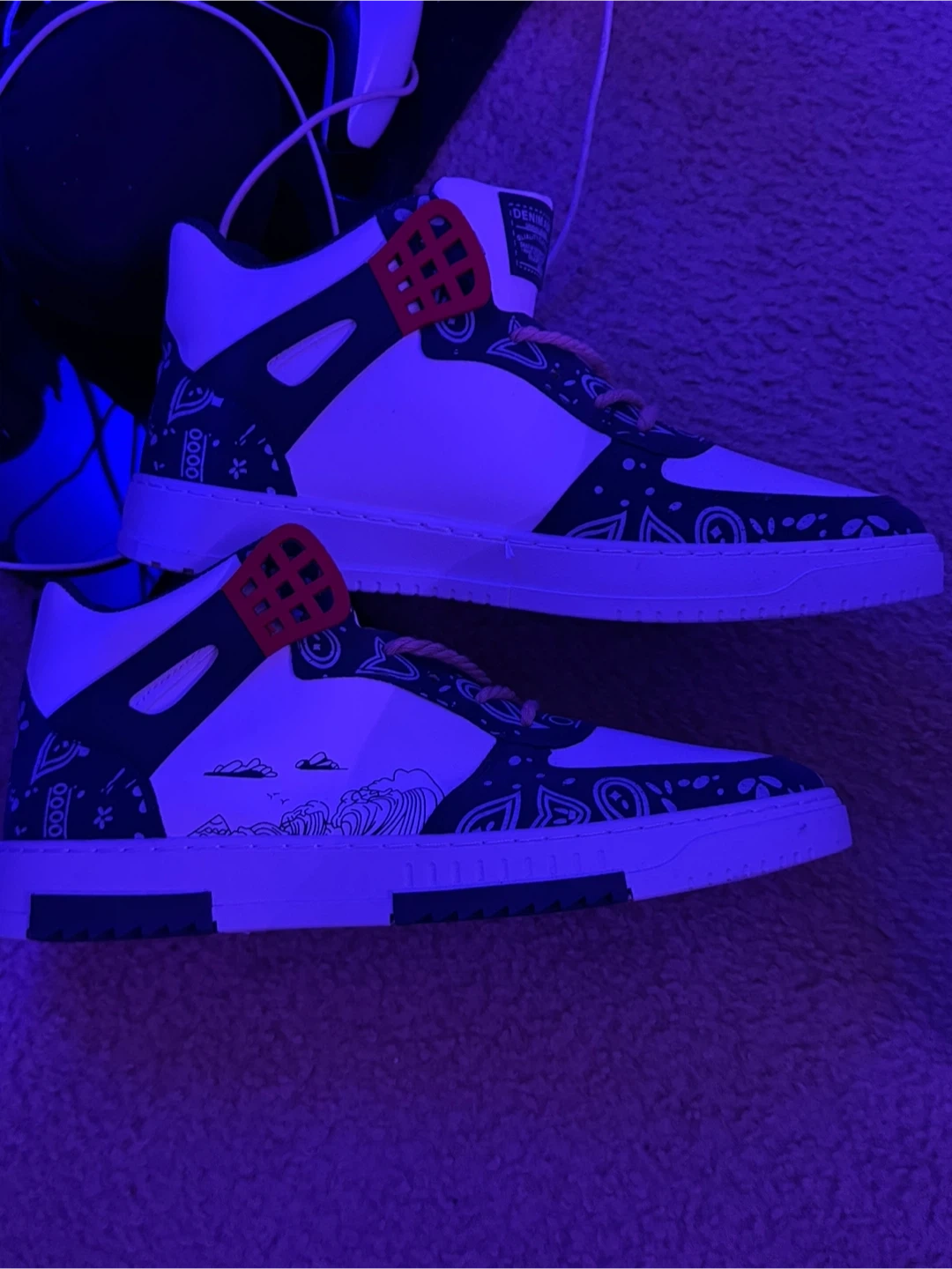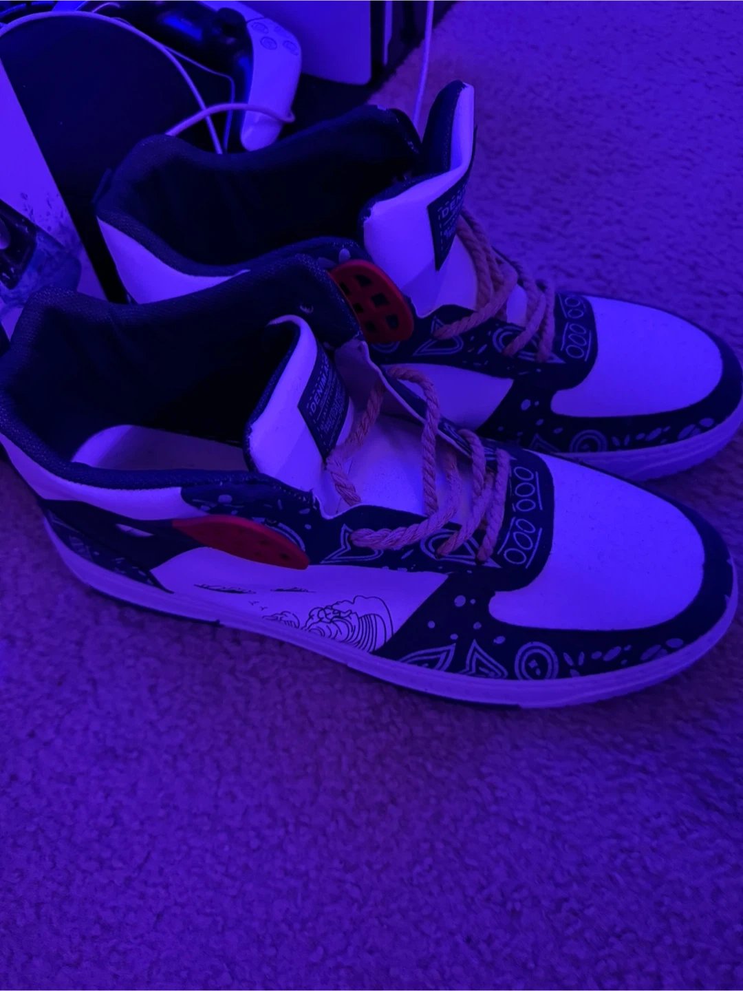 Original Deuce sneakers with a unique design! These sneakers feature a mix of white and dark blue with a bandana pattern and a wave design on the side. The laces are a light brown colour and the shoes also feature a red accent on the heel area. They're in great condition and ready for a new home
