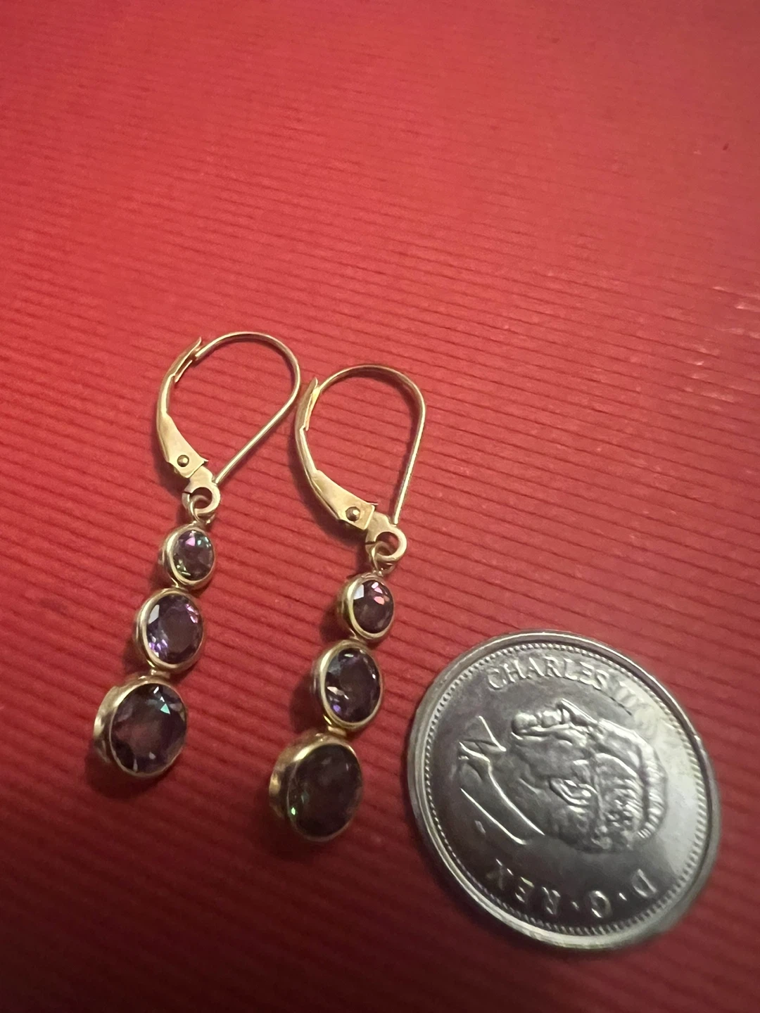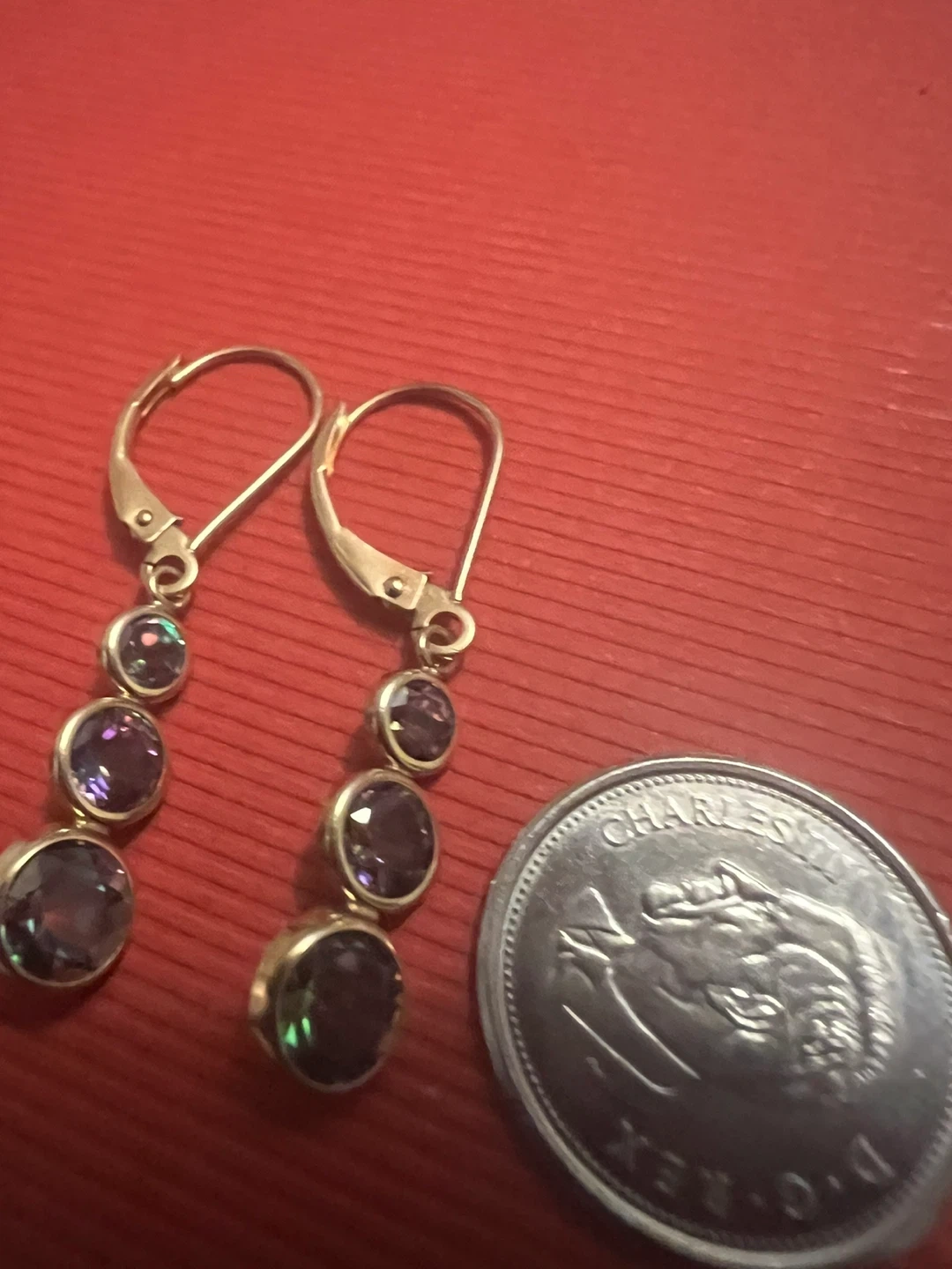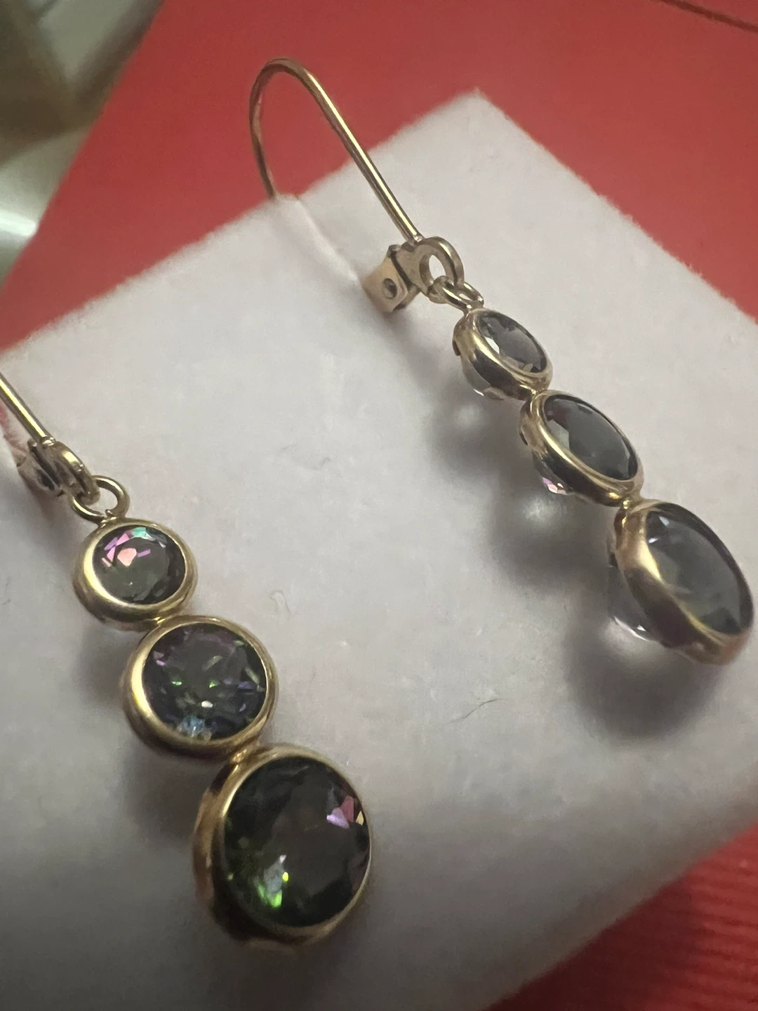 Beautiful dangle 10 k yellow gold earrings featuring mystic topaz stones! These earrings have a lovely iridescent shimmer and are set in a gold-tone metal. They're in great condition and ready to add a touch of elegance to any outfit