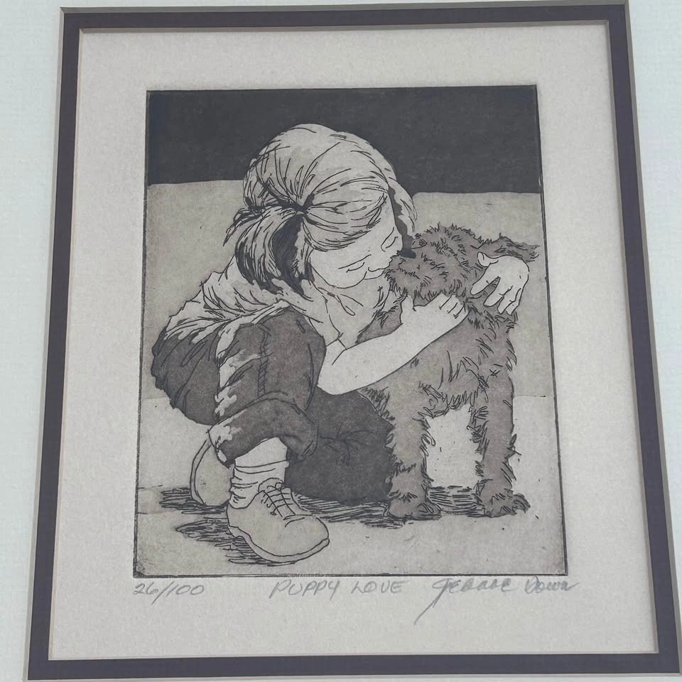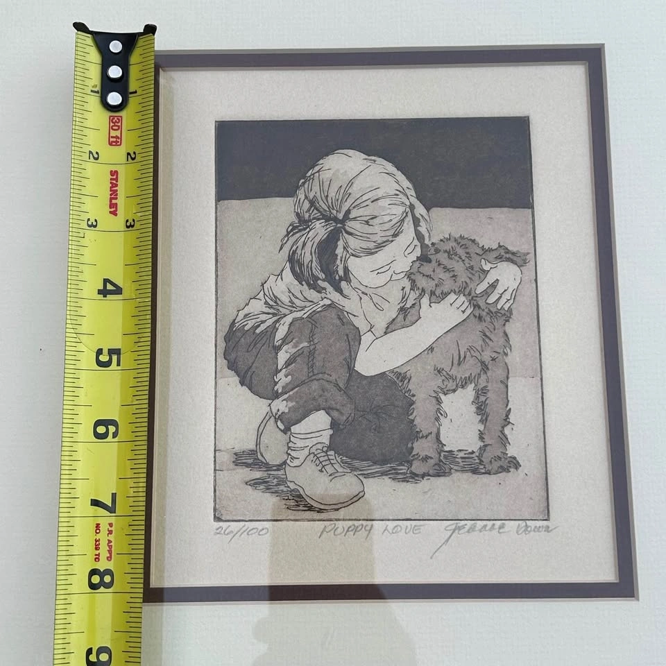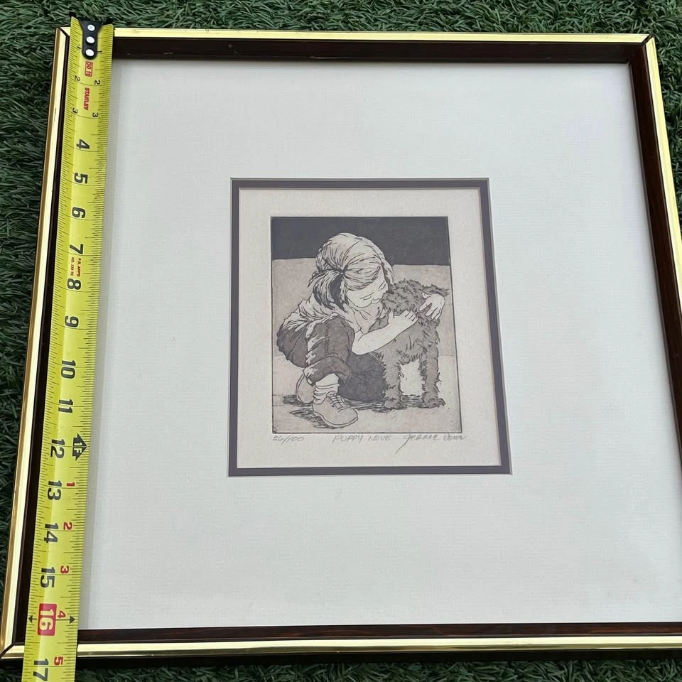 Framed limited edition etching titled “Puppy Love” by artist Jeanne Down. The piece depicts a touching moment of a young child hugging a puppy, rendered in beautiful etching technique. • Hand-signed by the artist • Edition: 26/100 (comes with Certificate of Authenticity from Lawrence Unlimited, California) • Frame size: approx. 17” x 17” • Medium: Etching on paper • Condition: Excellent vintage condition with frame Perfect for collectors of limited edition art or as a heartwarming piece for home décor. Pick up: Seton area, Calgary. See also my other lots. Open to your questions and suggestions. If necessary, I provide additional photos. These are not new things, so please look carefully at the photos and videos. Sizes are submitted on request and also using a tape measure in the photo.