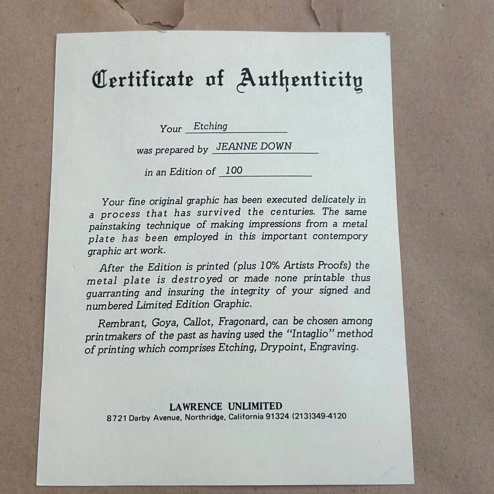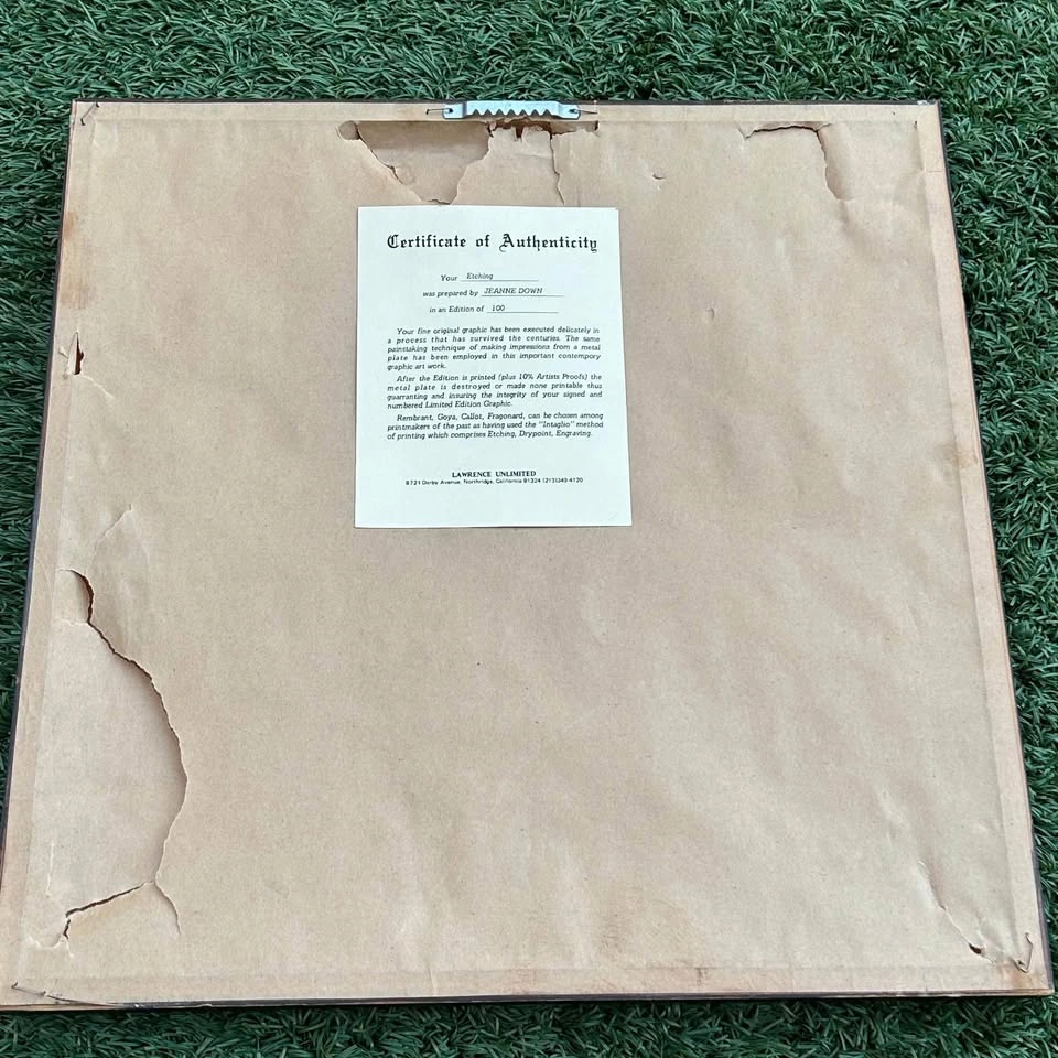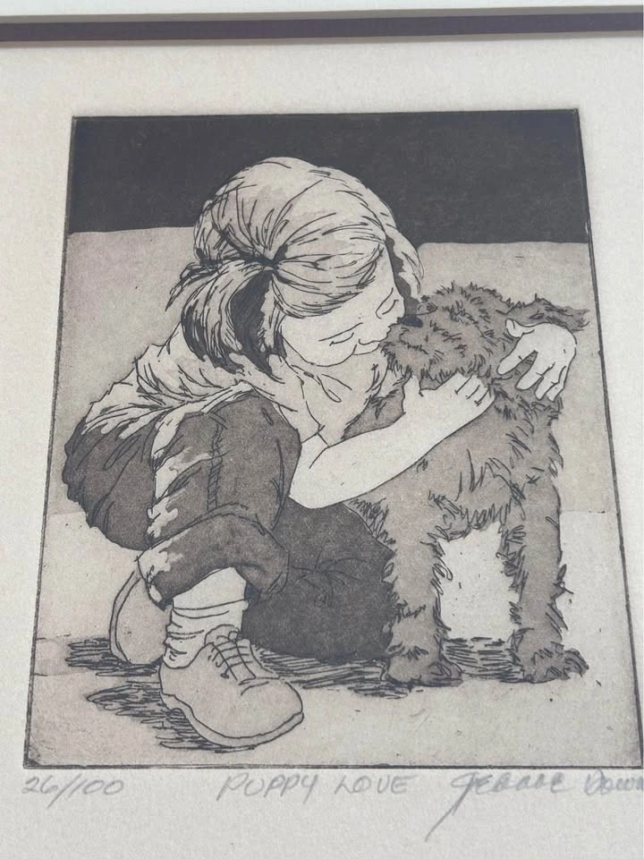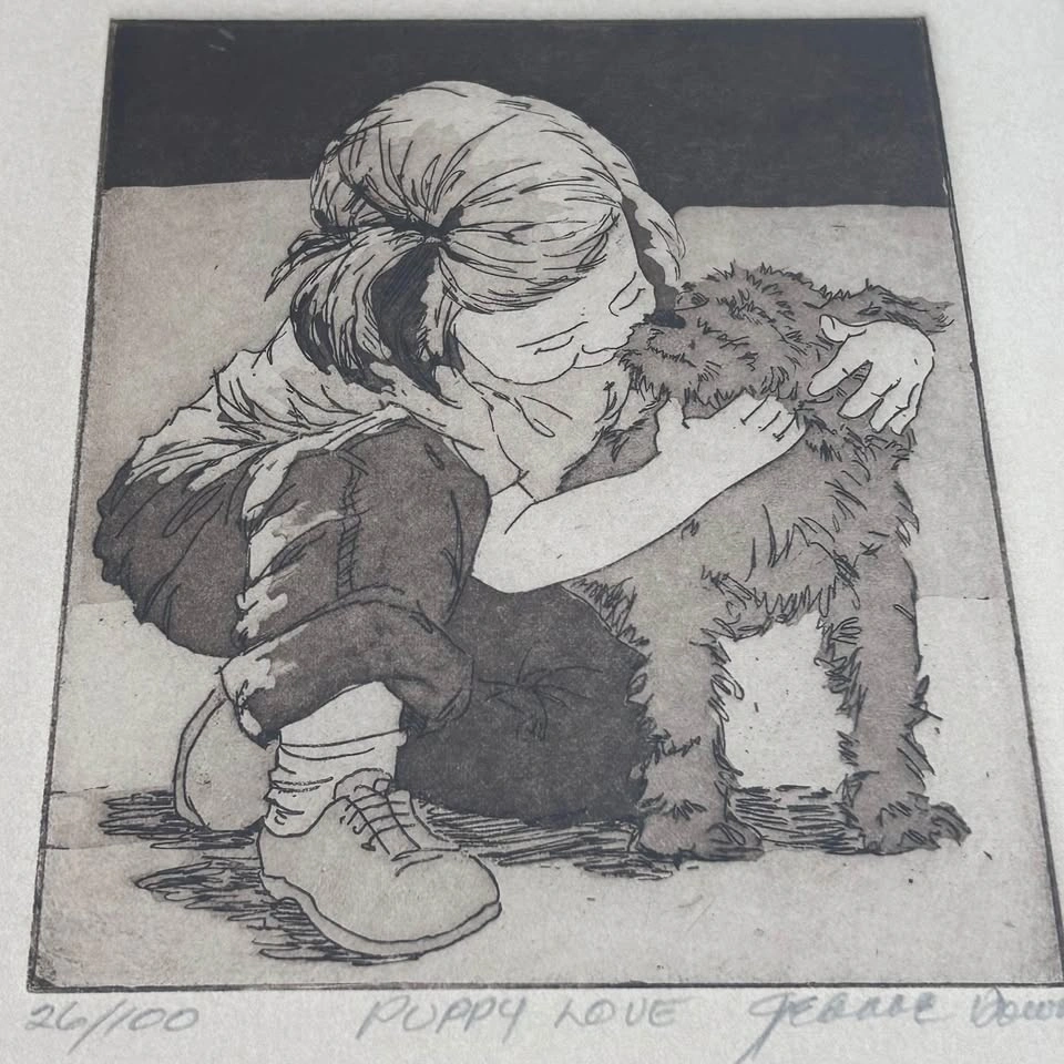 Framed limited edition etching titled “Puppy Love” by artist Jeanne Down. The piece depicts a touching moment of a young child hugging a puppy, rendered in beautiful etching technique. • Hand-signed by the artist • Edition: 26/100 (comes with Certificate of Authenticity from Lawrence Unlimited, California) • Frame size: approx. 17” x 17” • Medium: Etching on paper • Condition: Excellent vintage condition with frame Perfect for collectors of limited edition art or as a heartwarming piece for home décor. Pick up: Seton area, Calgary. See also my other lots. Open to your questions and suggestions. If necessary, I provide additional photos. These are not new things, so please look carefully at the photos and videos. Sizes are submitted on request and also using a tape measure in the photo.