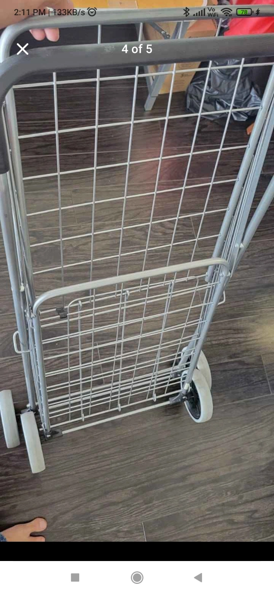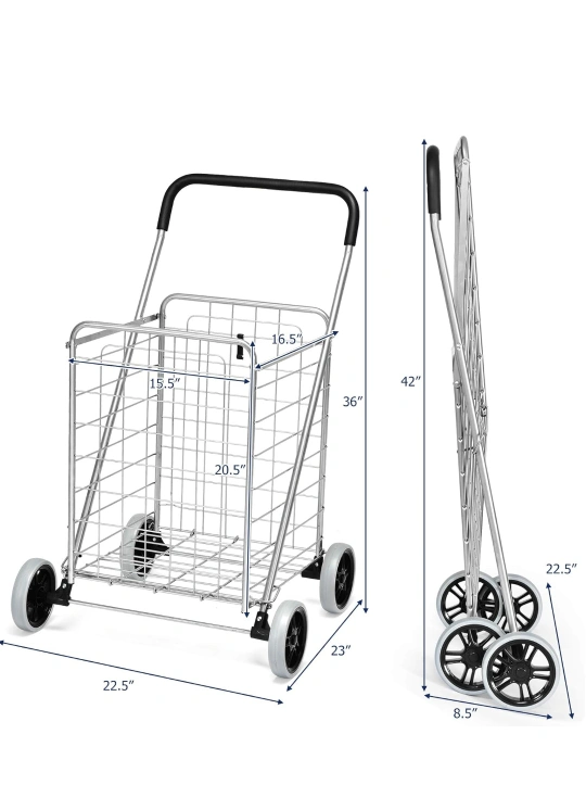 This folding shopping cart is perfect for grocery shopping or trips to the farmers market! It's made of durable silver metal and features four wheels for easy maneuverability. When not in use, it folds flat for convenient storage. The dimensions are approximately 22.5" x 20.5" x 36". sold as is, moving sale
