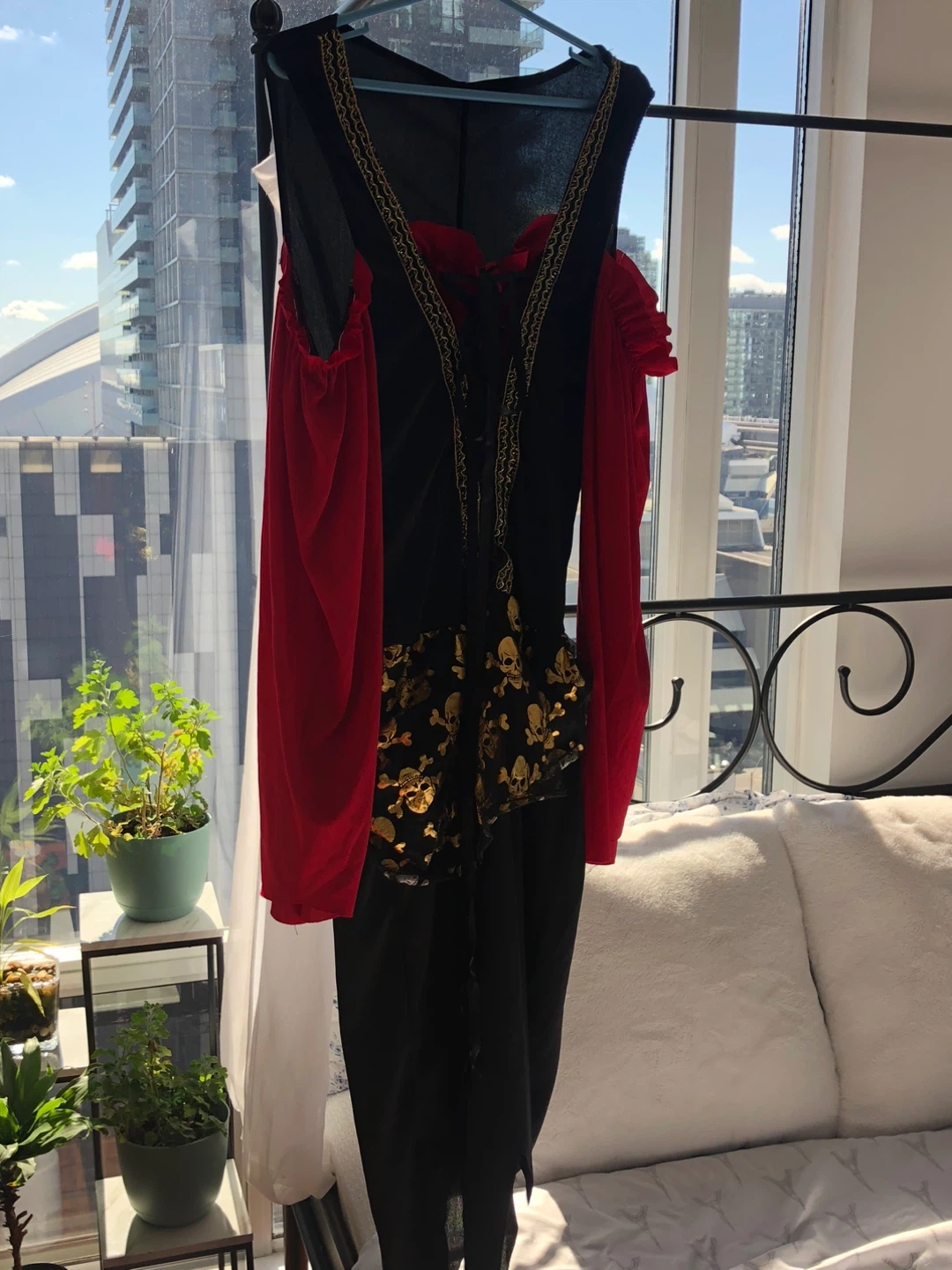Ahoy there! I'm selling a pirate costume dress. It features a black bodice with gold trim, red sleeves, and a skirt with a skull and crossbones design. Perfect for Halloween or a themed party!