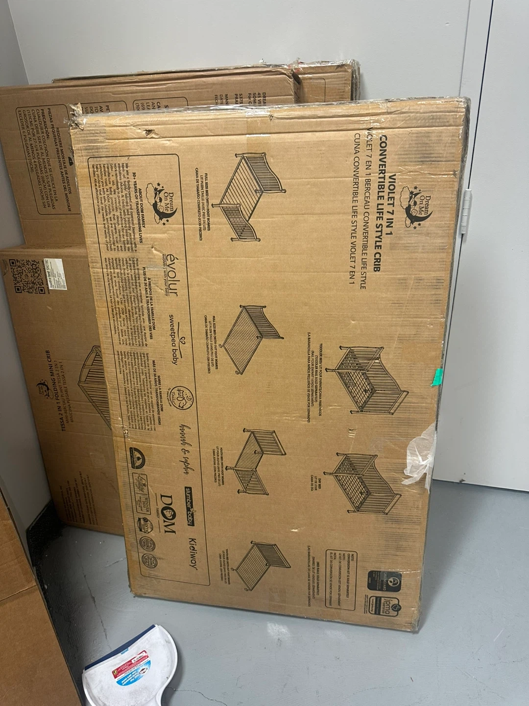 Selling an Evolur Violet 7-in-1 Convertible Life Style Crib in an espresso finish! This versatile crib converts to a toddler bed, daybed, and full-size bed, adapting to your child's growing needs. It's a stylish and practical choice for any nursery. The box includes all the components for assembly