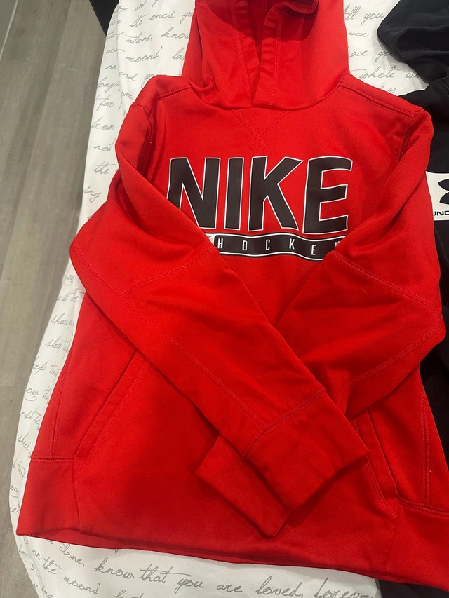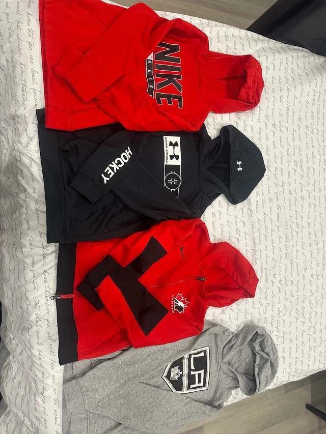 Boys hockey hoodies 1 x Nike hockey hoodie M 1 x Under Armour hockey hoodie M 1 x Nike hockey Canada zip up hoodie M 1 x NHL LA Kings hoodie M All in very good condition!