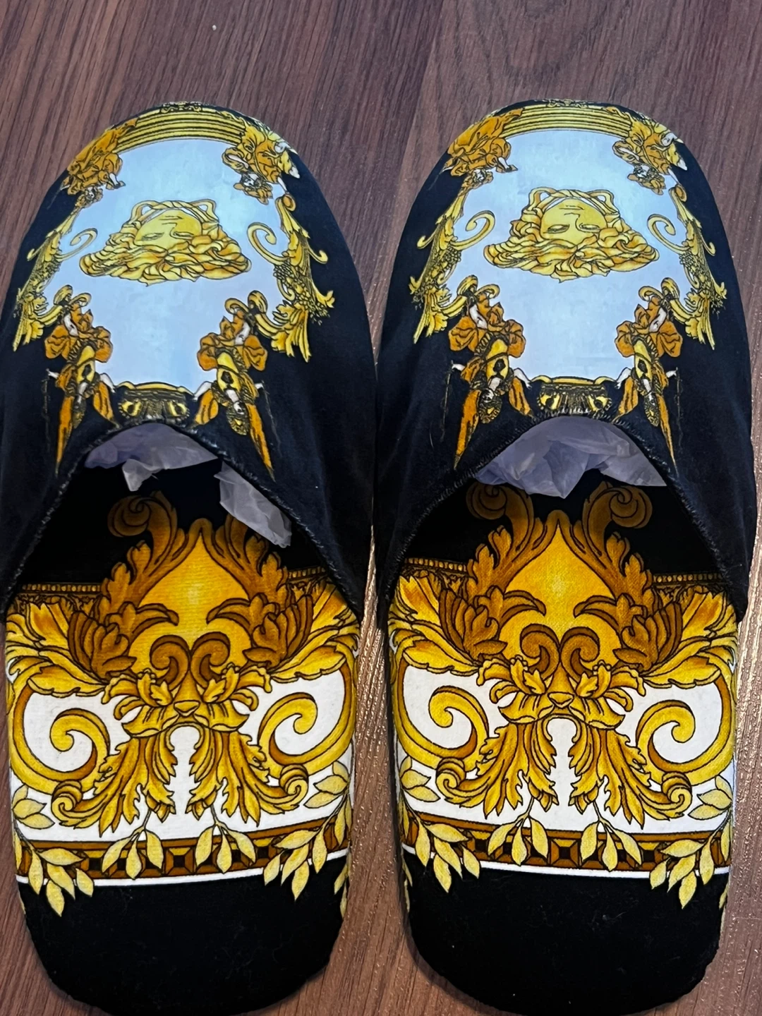 Authentic. Brand new ***unisex*** Purchased in Versace.com for $250+ comes with receipt Versace I Heart Baroque slippers. The slippers feature a black and gold baroque design. They are in immaculate condition and very stylish! **Check my other listings for more authentic designer items** Size: Small refer to photo for measurement Tags: authentic, designer, indoor slippers, Versace, unisex