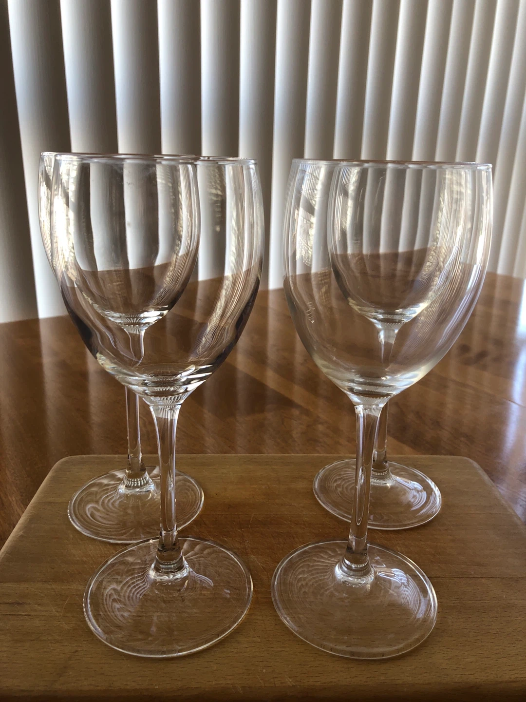 Selling a set of four wine glasses. They are in excellent condition and ready for your next dinner party! No chips or cracks. Cheers!
