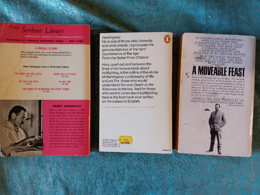 Selling a set of three Ernest Hemingway books: - A Farewell to Arms - Death in the Afternoon - A Moveable Feast All in good condition and ready for a new reader!
