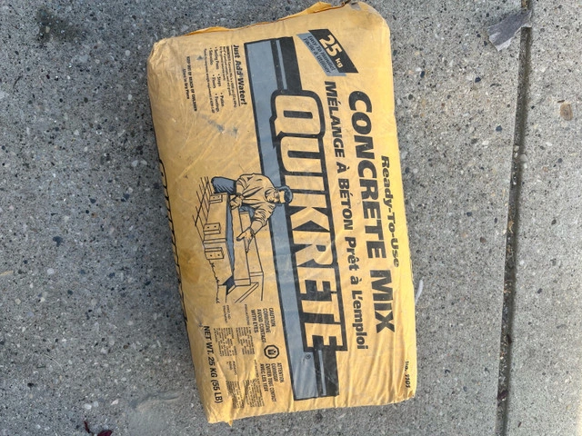 I'm offering 1 & 3/4 bags of Quikrete concrete mix, each bag containing 25 kg of ready-to-use concrete, perfect for small to medium-sized projects. The bags have been stored in a dry environment, ensuring the mix is still in good condition. Here are the specifications: * Type: Ready-to-use Concrete Mix * Weight: 25 kg (55 lb) per bag * Usage: Just add water! * Ideal for: Small repairs, steps, patios, sidewalks, floors, and footings Please note that one bag has been partially used. I'm pricing these to sell quickly for your convenience! If the ad is up, it's available!