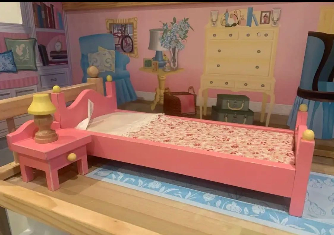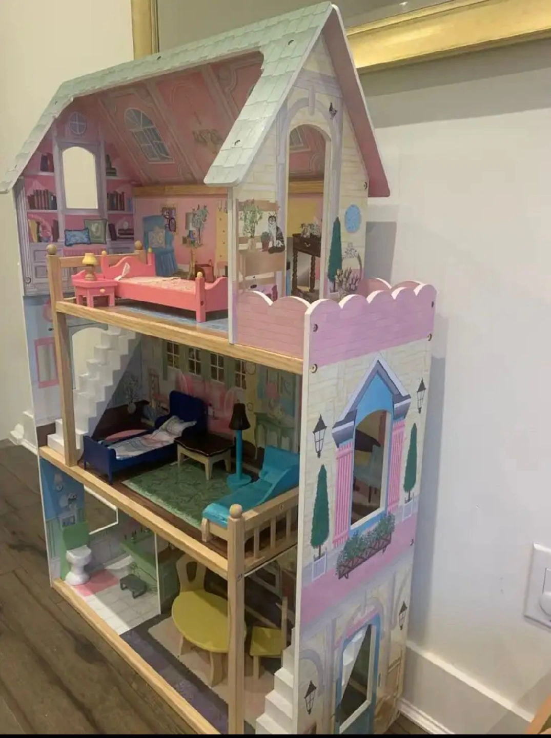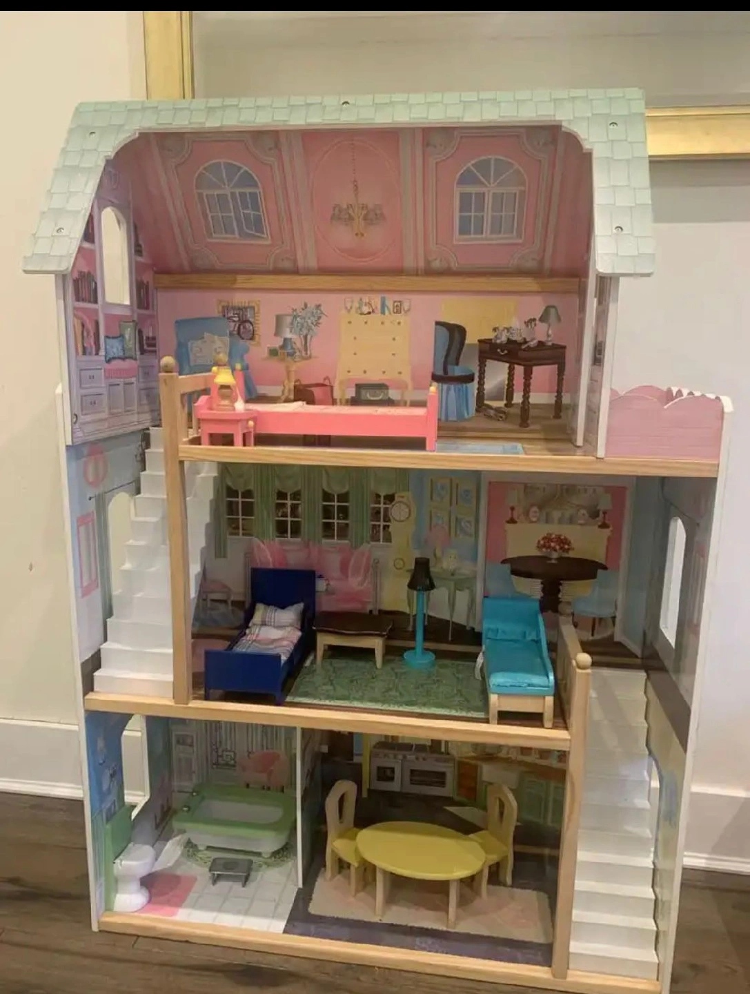 Selling a dollhouse that comes with furniture. It includes beds, chairs, tables, and other accessories.