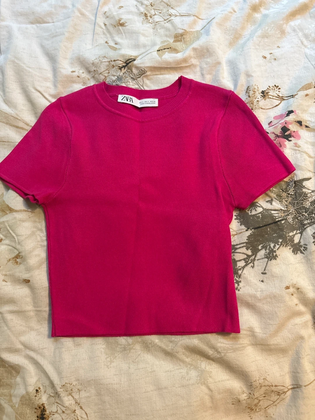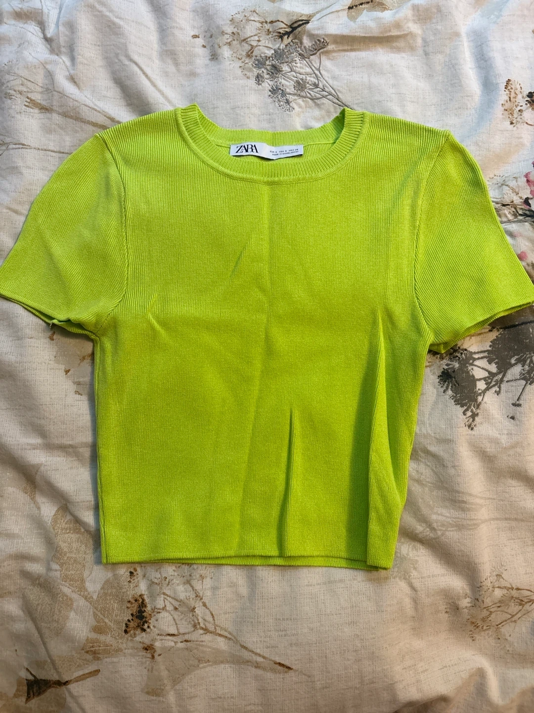Selling two Zara knit crop tops. One is a vibrant pink and the other is a bright neon green. They're both in great condition and perfect for adding a pop of colour to your wardrobe. $10 each.