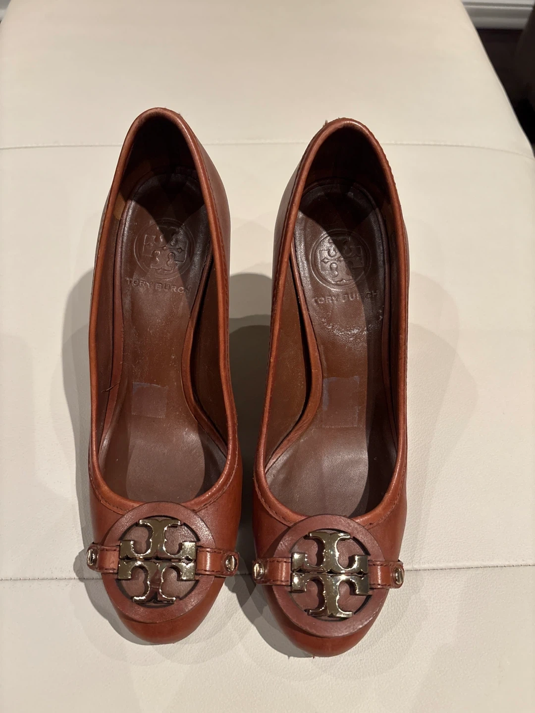 These are a pair of Tory Burch heels in a lovely brown leather. They feature the iconic Tory Burch logo on the front. They're in great condition and ready for a new home!