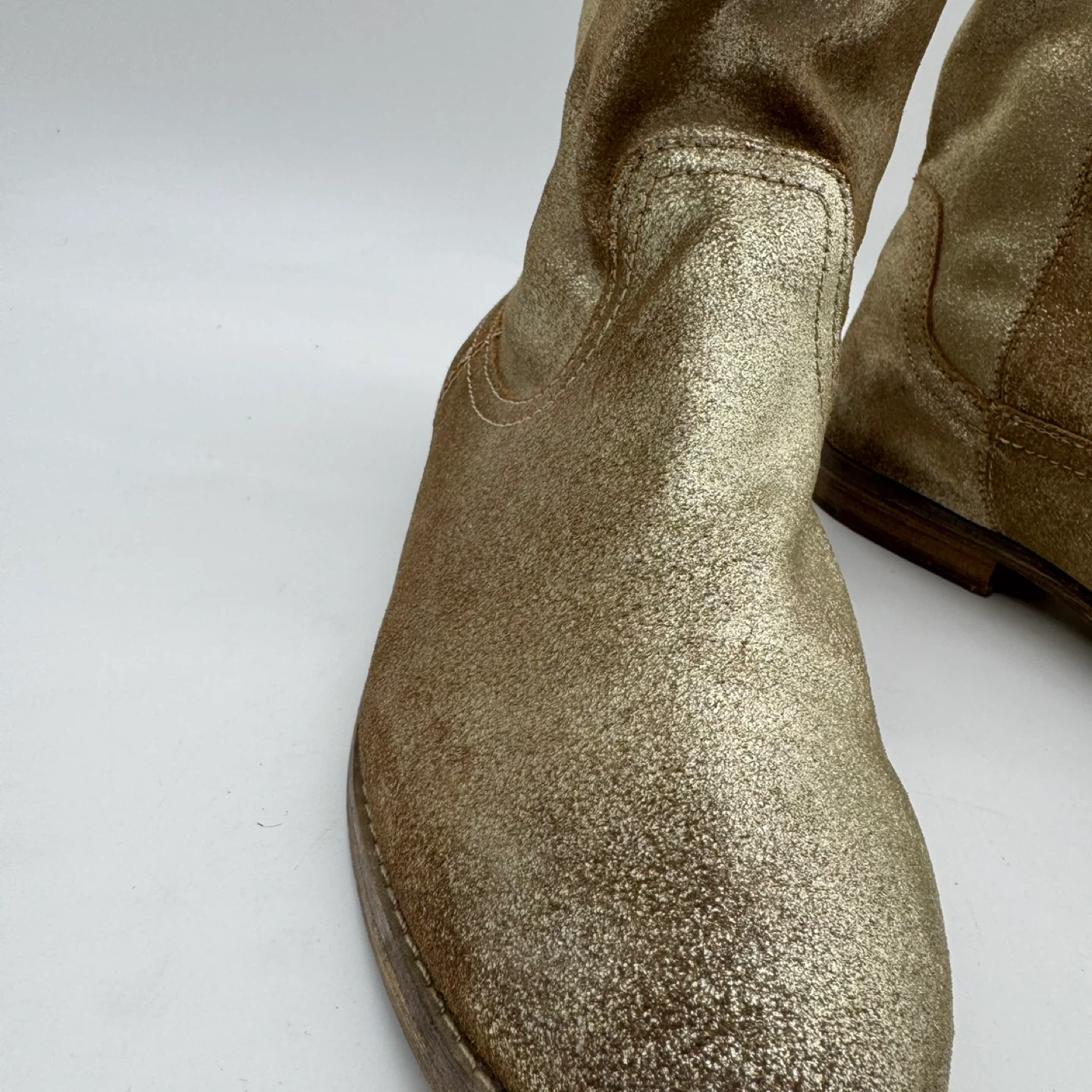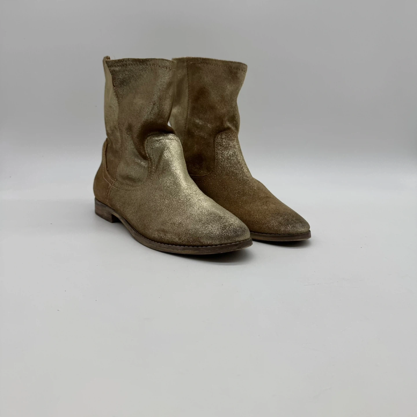 Stylish ALDO gold suede ankle boots. Women's size 8.5 US / 39 EU / 6 UK. Genuine suede upper with a soft lining and comfortable fit. Perfect for casual or dressy outfits. Condition: Used - shows normal signs of wear (see photos). Pickup in North York Delivery available for extra (S11)1322