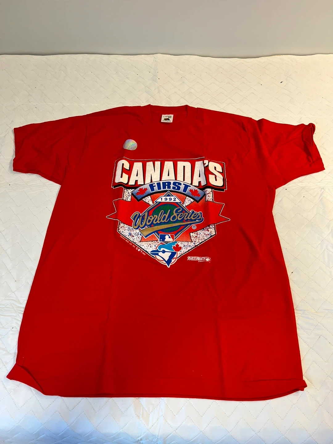 Selling a vintage red T-shirt celebrating the Toronto Blue Jays' 1992 World Series win! The shirt features a bold graphic with the text "CANADA'S FIRST 1992 World Series" and the Blue Jays logo. A great piece of memorabilia for any Jays fan!