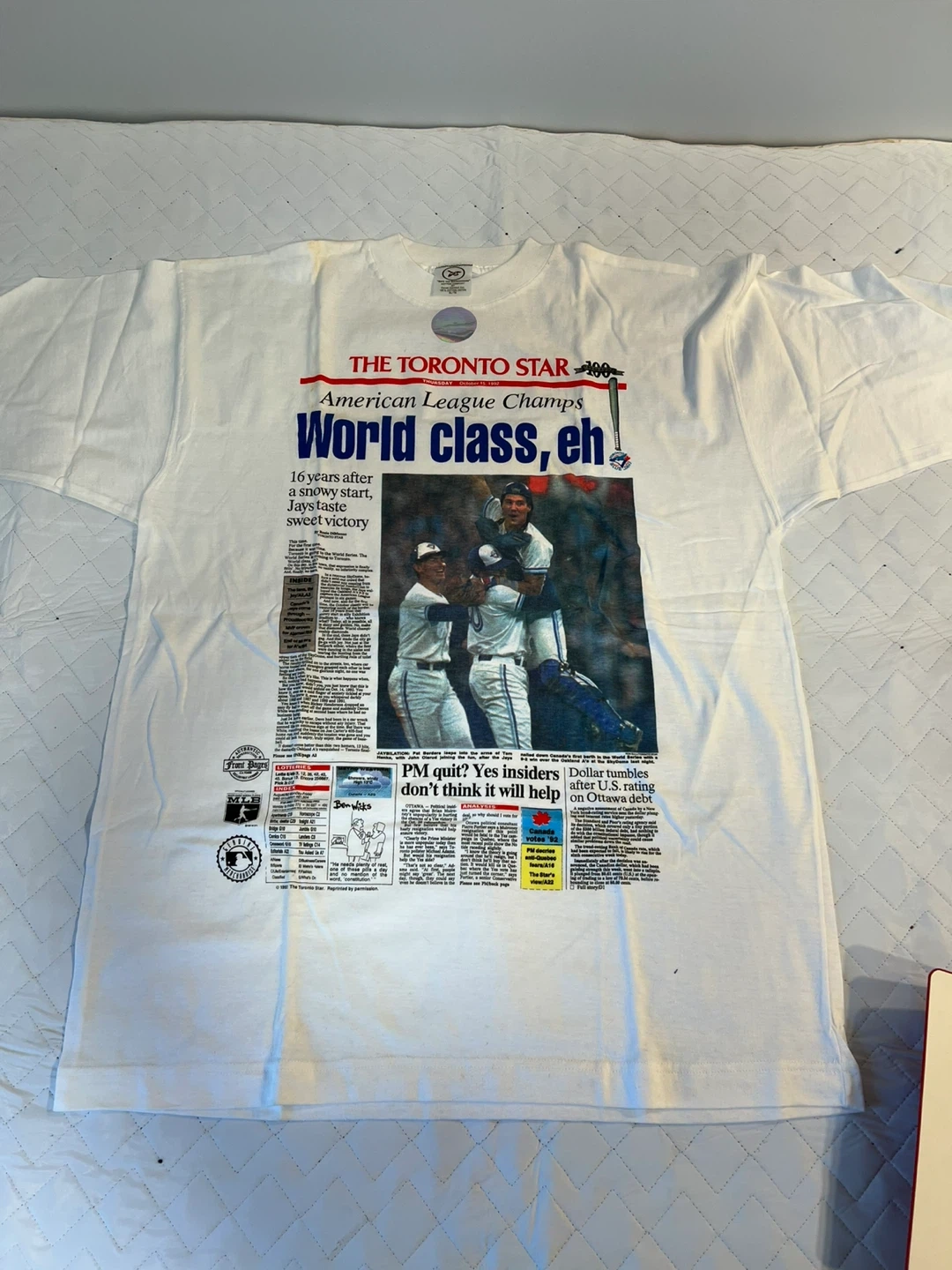 Selling a Toronto Star T-shirt celebrating the Blue Jays' World Series win! Features a newspaper print design. Great for any Jays fan!