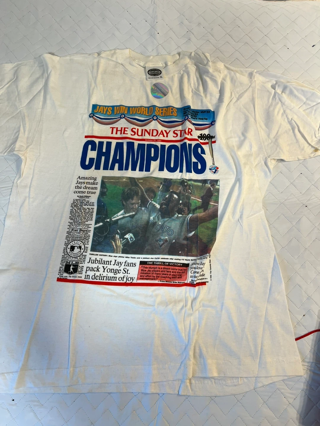 Vintage Toronto Blue Jays 1992 World Series Champions T-Shirt in size XL! The shirt commemorates the Jays' victory with a newspaper-style design featuring headlines and images from the historic win. A great piece for any Jays fan or vintage sports collector The Sunday Star