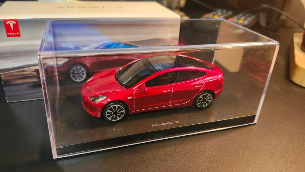 Selling a Tesla Model 3 diecast car. It is red and comes in its original box. Perfect for a Tesla enthusiast or a diecast collector!