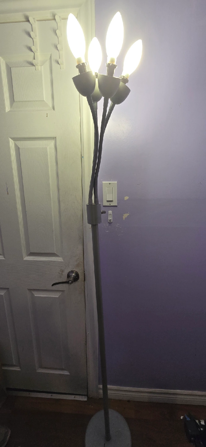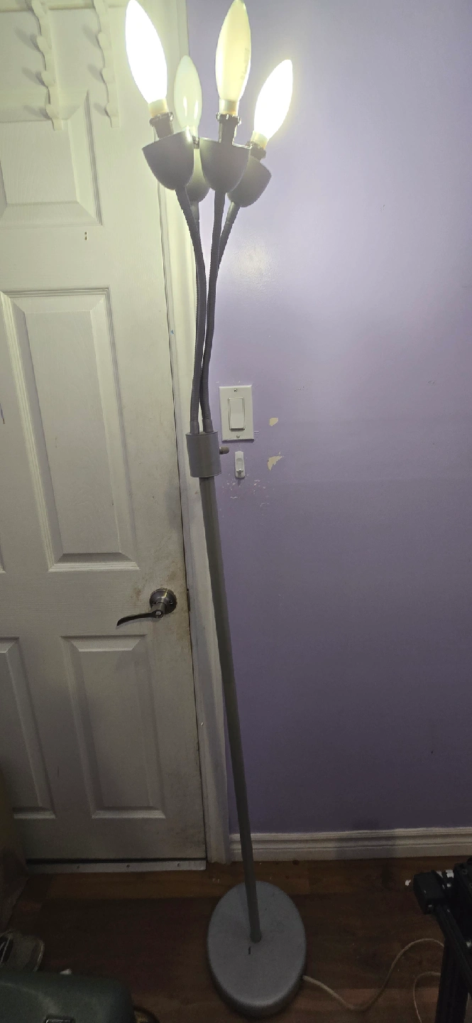 Selling a floor lamp! It's in good condition and ready to brighten up your space. It features multiple lights on flexible stems, allowing you to adjust the lighting to your liking. Perfect for adding a touch of modern style to any room
