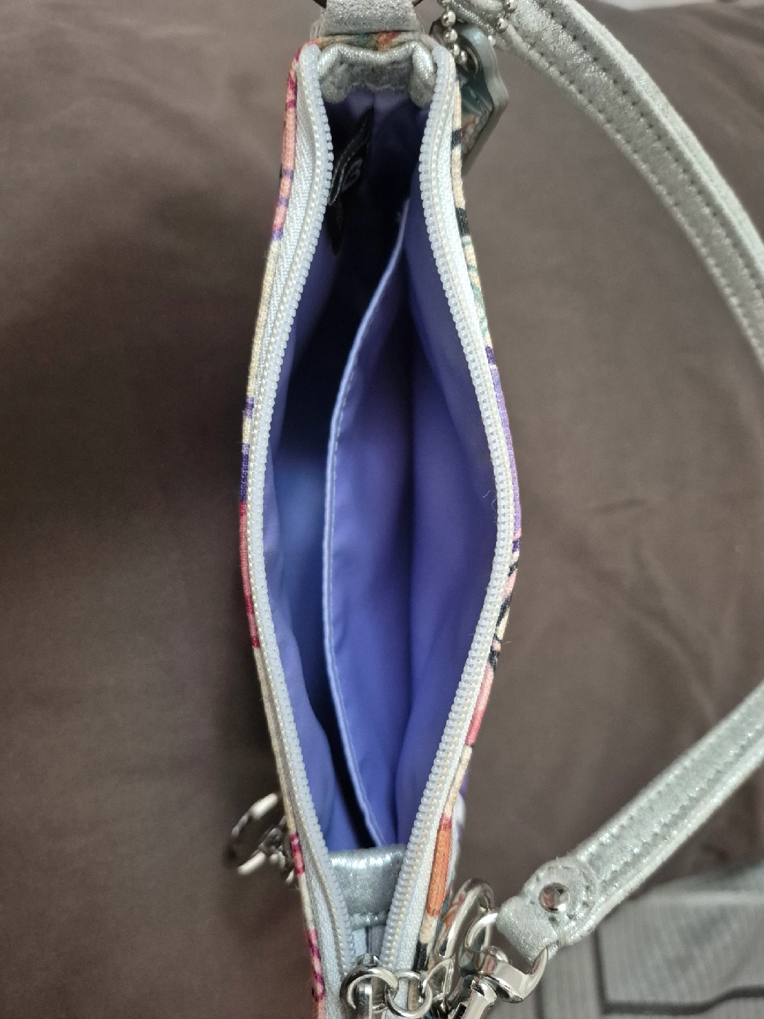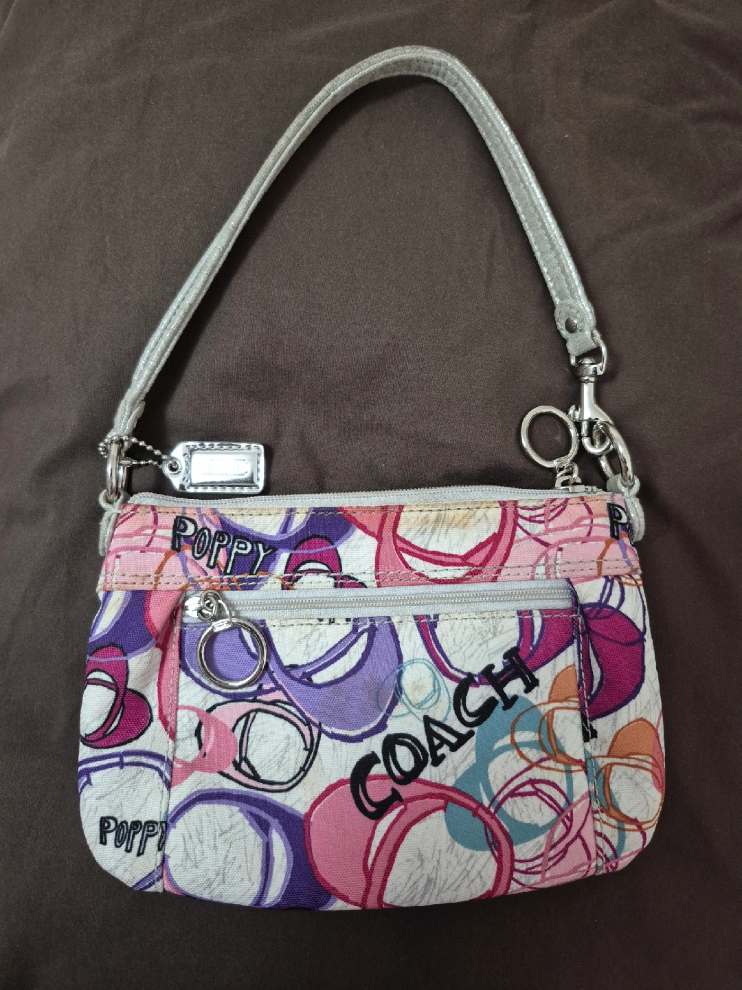Selling a cute Coach Poppy handbag! It features a colourful design with the Coach logo and 'Poppy' printed on it. The strap is a shiny silver colour. Inside, there's a purple lining with a couple of handy pockets. Perfect for adding a pop of fun to your outfit!