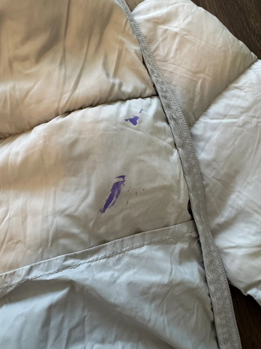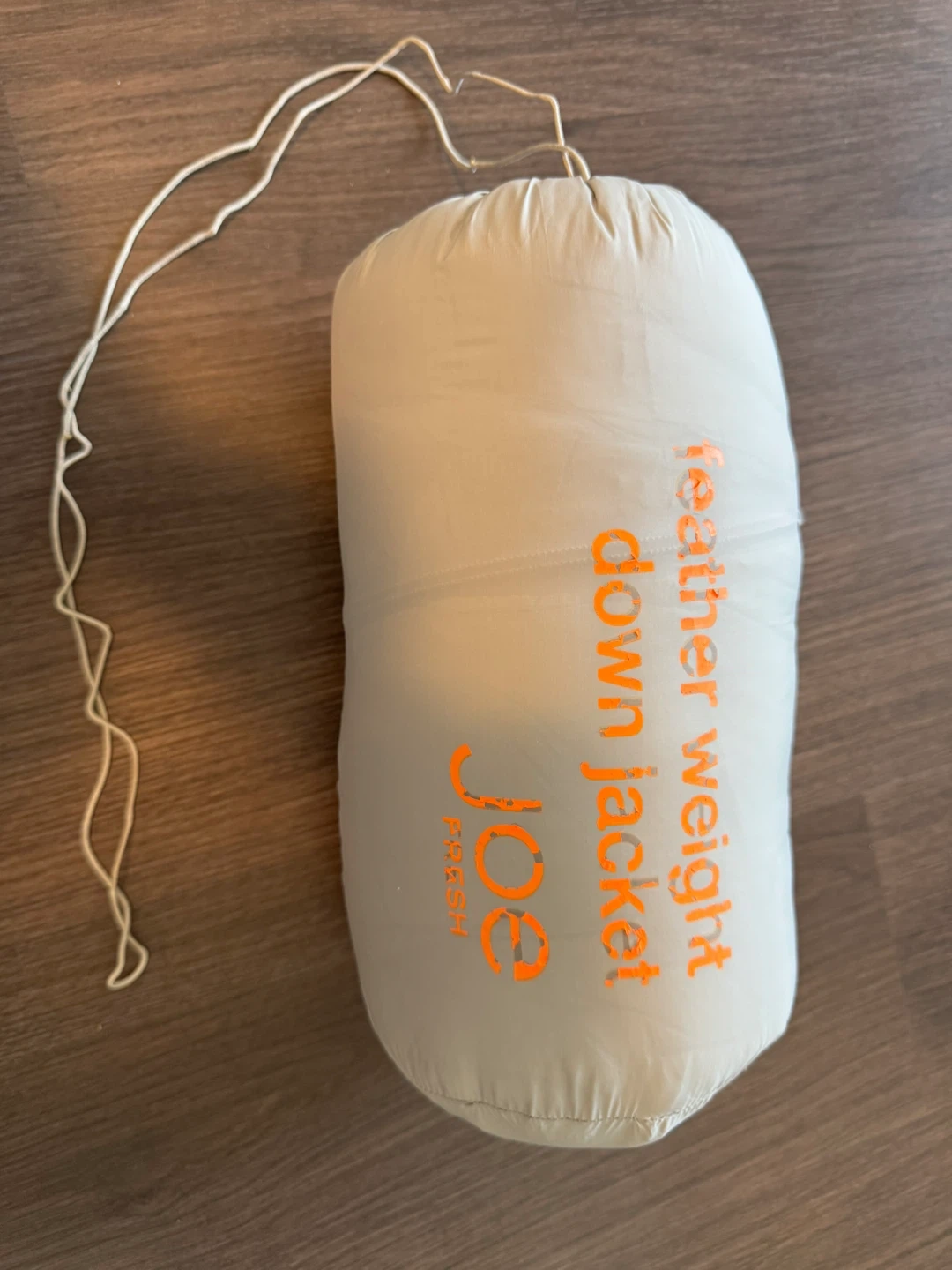Selling a Joe Fresh feather weight down jacket. It's a light beige colour and comes with its original stuff sack. There are some marks on the jacket as shown in the photos. Size L