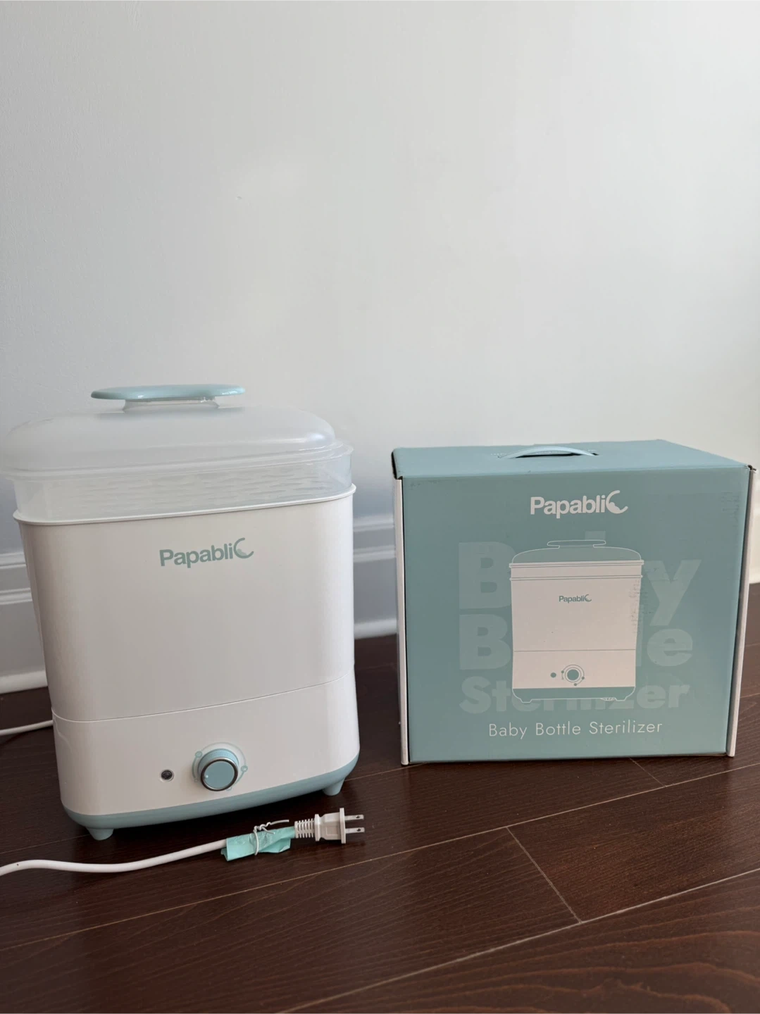 Selling a Papablic baby bottle sterilizer! It comes with the original box. This sterilizer is perfect for keeping your baby bottles clean and safe. It's in great condition and ready for a new home!