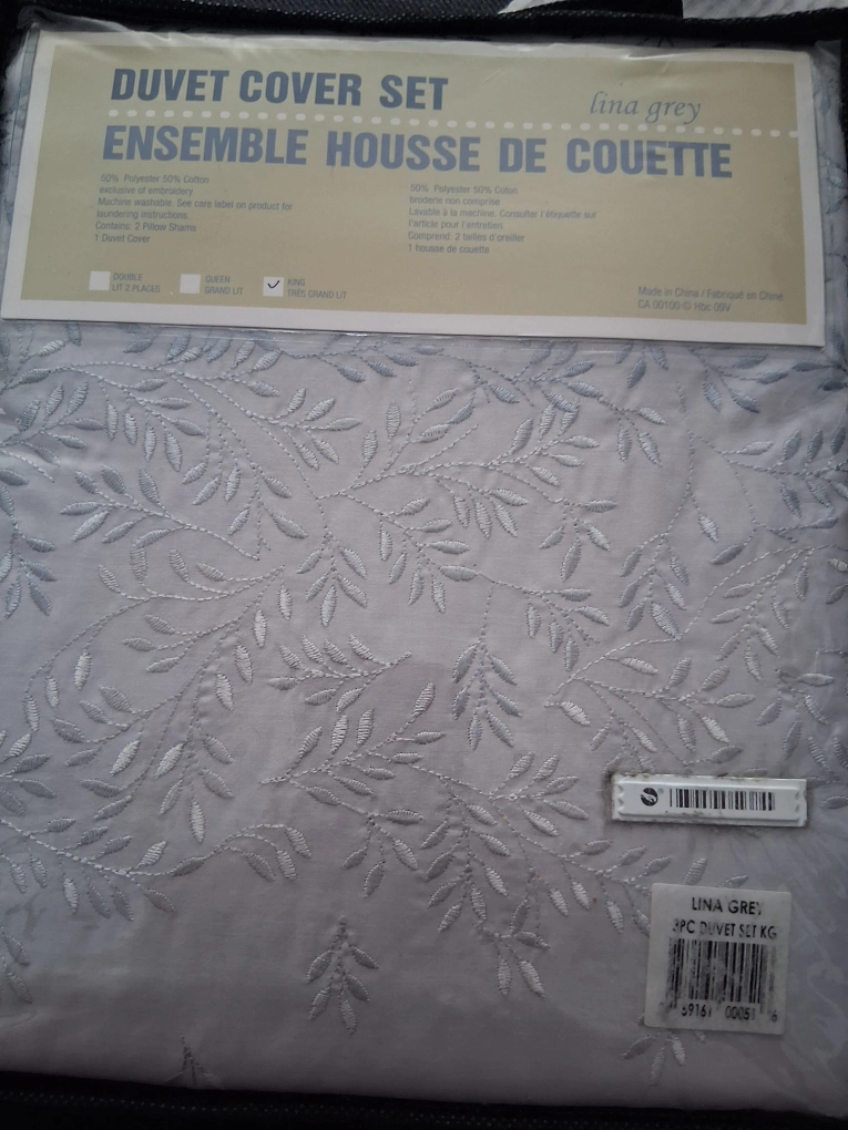 Selling a Lina Grey duvet cover set for a king size bed! It's made of 50% polyester and 50% cotton, exclusive of embroidery. The set includes two pillow shams and one duvet cover. Machine washable, see care label on product for laundering instructions