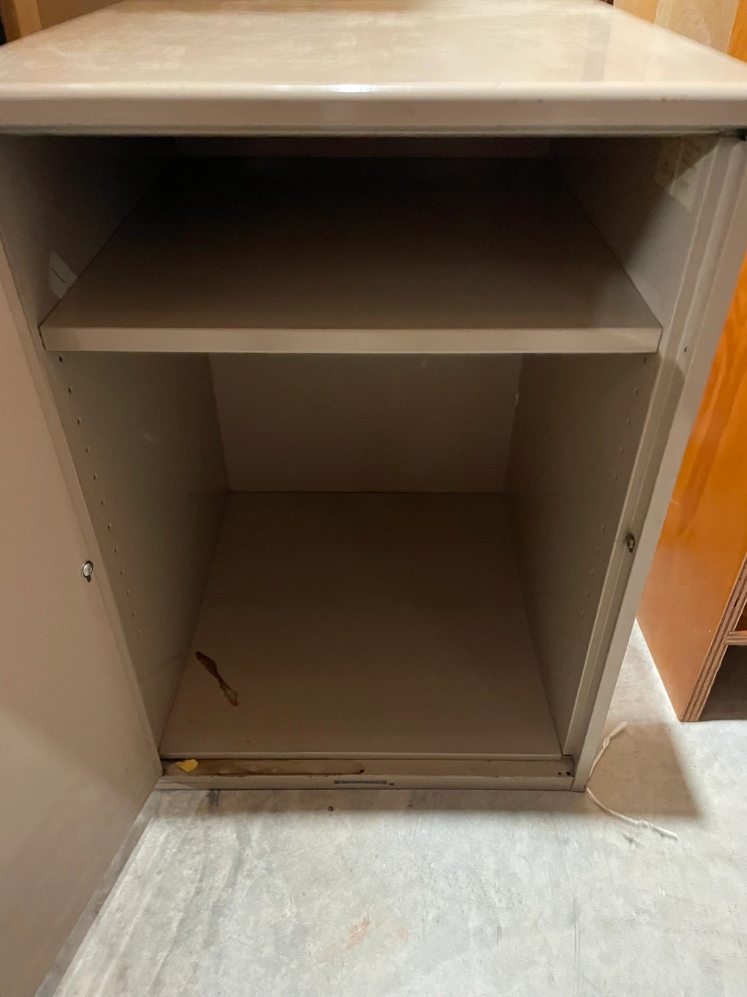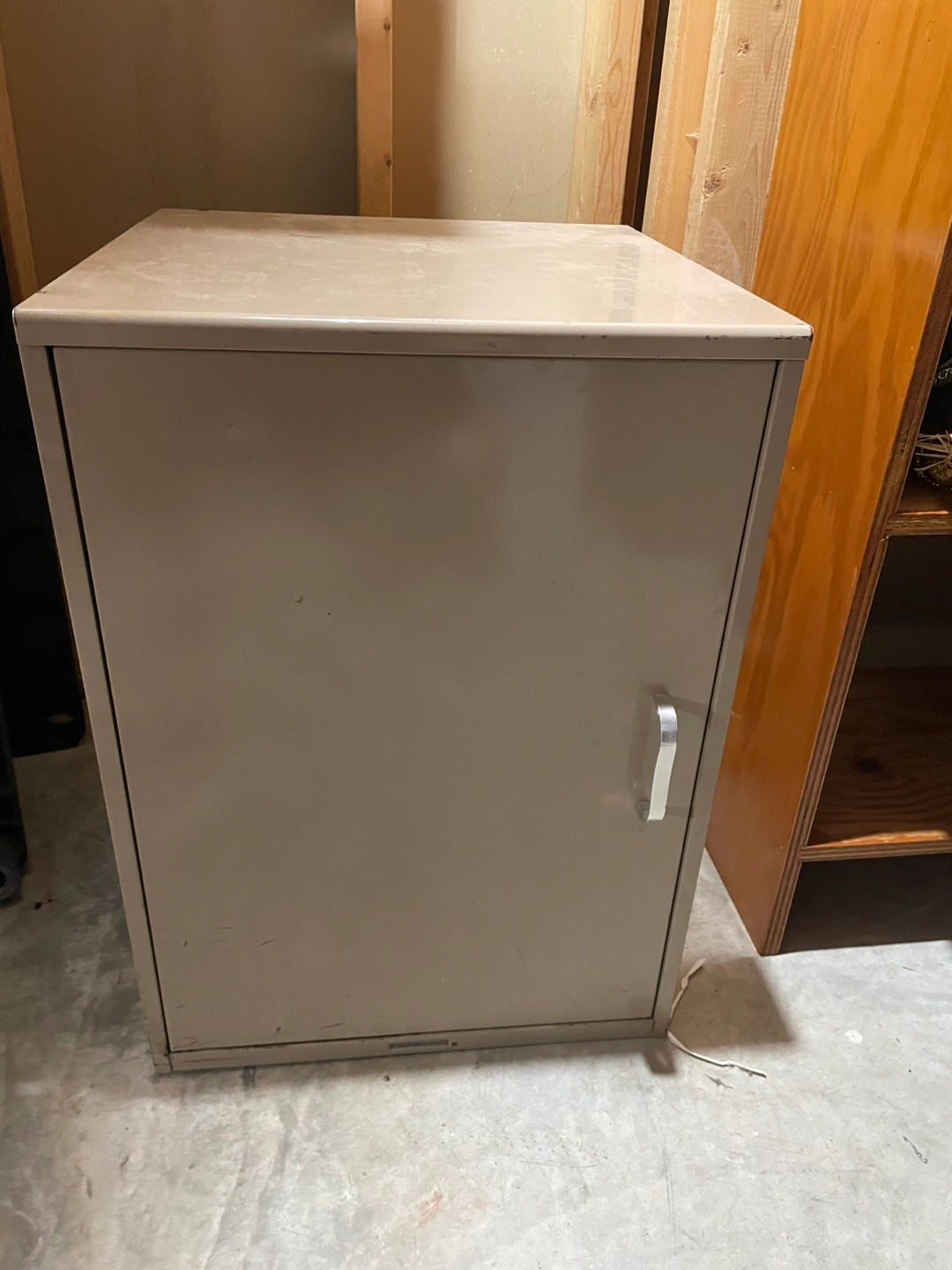 Here's a beige metal cabinet that could be perfect for extra storage in your home or office. It's a simple design with a single door and a handle. Inside, there's a shelf to help you organize your items. It's a sturdy piece that's ready to use only take cash no e-transfers thank you