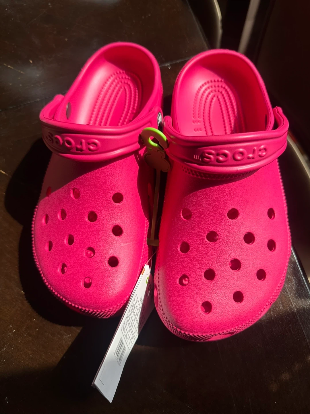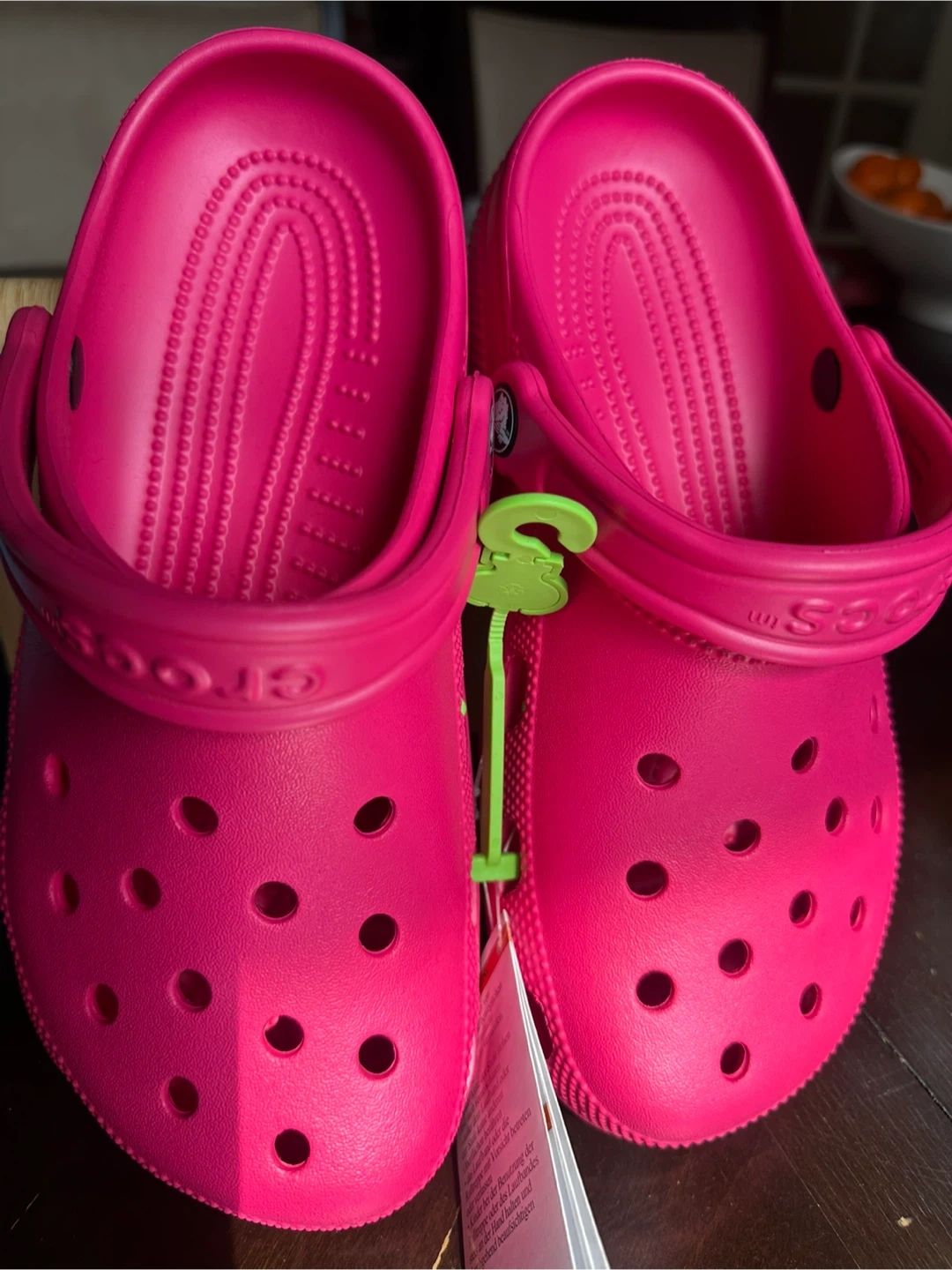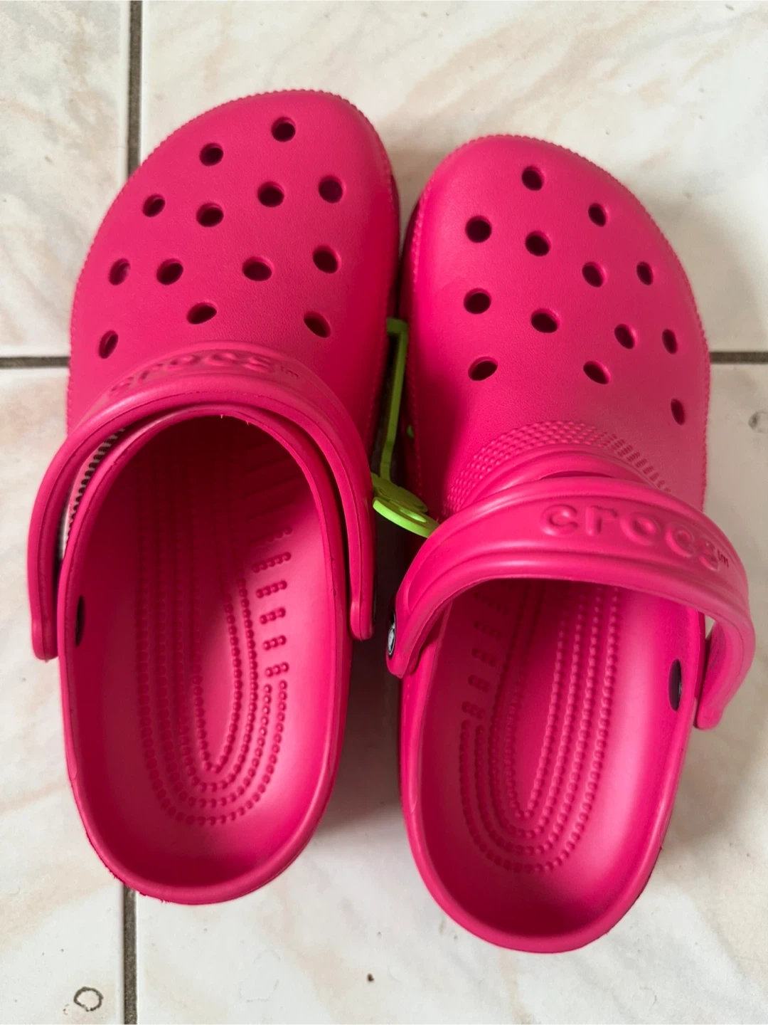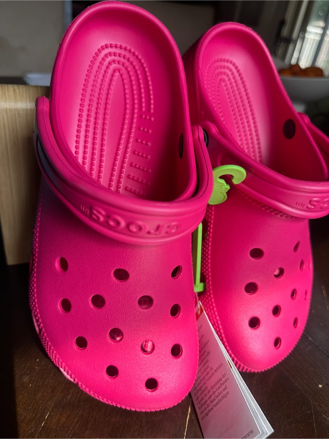 Selling a pair of brand new Crocs Classic Clogs in a vibrant pink colour! They are a size 8 for women and size 6 for men. Perfect for adding a pop of colour to your wardrobe or for comfy everyday wear