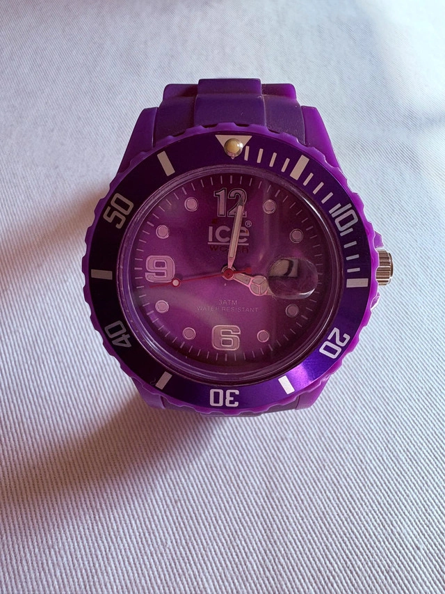 Arrive on time and in style with this sleek, water-resistant ICE watch. A versatile accessory with its soft silicone band and modern design, this watch is perfect for both casual looks and active lifestyles. A brand-new battery has just been installed ✅ — ready to wear and keep perfect time! ✨ Features: Stylish Purple Design – Bold, trendy & versatile ⏱️ Quartz Movement – Accurate and reliable timekeeping Water-Resistant up to 165 ft (50 m) – Perfect for swimming & showering Soft Silicone Band – Lightweight, flexible, and ultra-comfortable Brand-New Battery – No maintenance needed Condition: Excellent condition – minimal signs of wear Fully functional and ready to wear Price: $55 (Retails for $130+) Pickup in Thornhill | Local Delivery Available