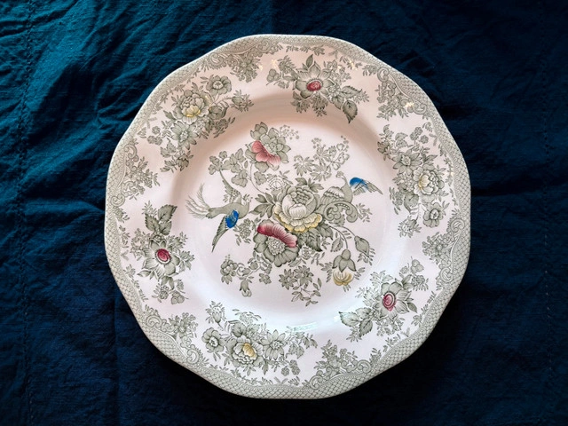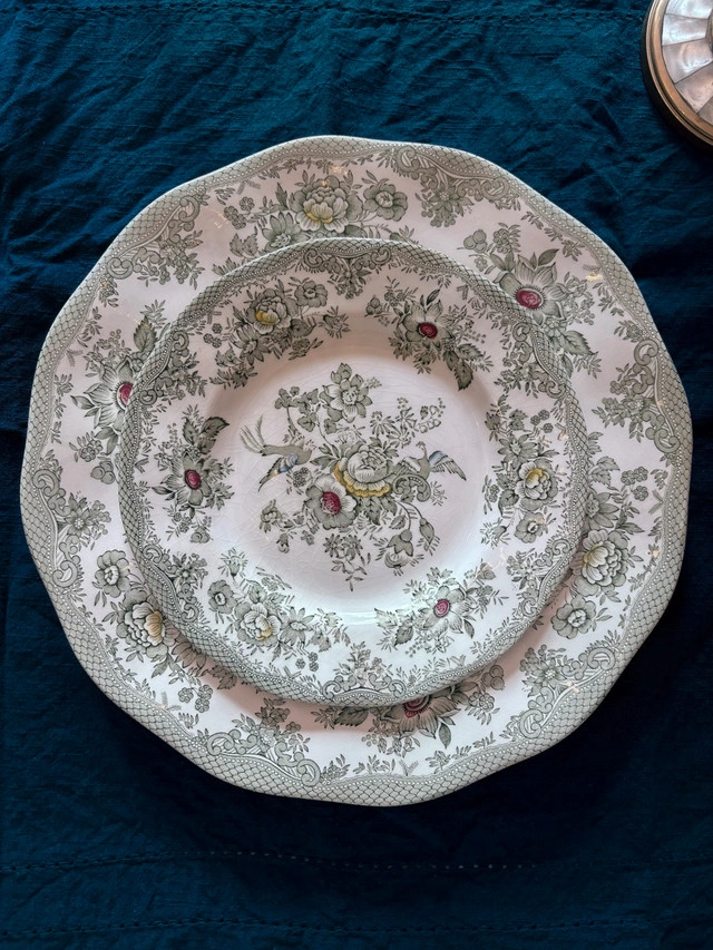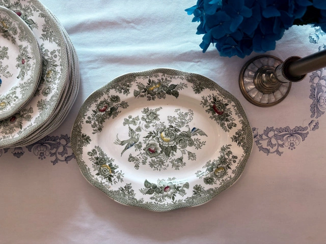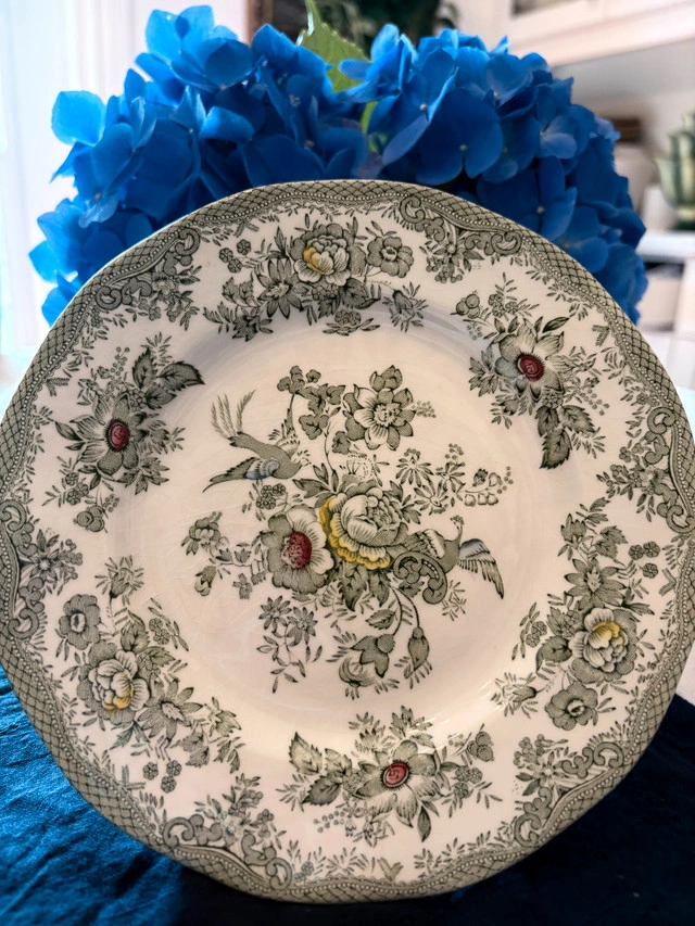 Set a stunning Thanksgiving table this October with vintage dishes that add timeless charm and elegance to your holiday feast. Featuring the stunning Kent Sage Green pattern with delicate florals and elegant asiatic pheasants, this set is a true collectible treasure for vintage lovers, dinnerware enthusiasts, and interior stylists alike. Perfect for display, entertaining, or adding a touch of classic elegance to your home! Set Includes (12 Pieces Total): - 2 Small Dessert Plates – 17.5 cm ($20 each) - 9 Large Dinner Plates – 25 cm ($25 each) - 1 Small Serving Platter – 31 cm x 24 cm ($45) ✨ Features & Details: ✔️ Maker: Enoch Wedgwood (Tunstall) Ltd. ✔️ Pattern: Asiatic Pheasants in Kent Sage Greenwood ✔️ Material: High-quality vintage English Ironstone ✔️ Condition: Immaculate – no chips, cracks, or fading Why You’ll Love It: This Kent Sage Green pattern is known for its timeless countryside aesthetic and rare availability in full sets. The pieces are exceptionally durable yet elegant, making them perfect for: - Vintage & cottagecore décor - Hosting stylish dinner parties - Enhancing your home’s charm Gifting to a collector or vintage enthusiast Price: $295 for the complete 12-piece set ✨ Comparable sets often sell for $350+ online — this is an excellent opportunity to own a rare vintage collection at a great value!