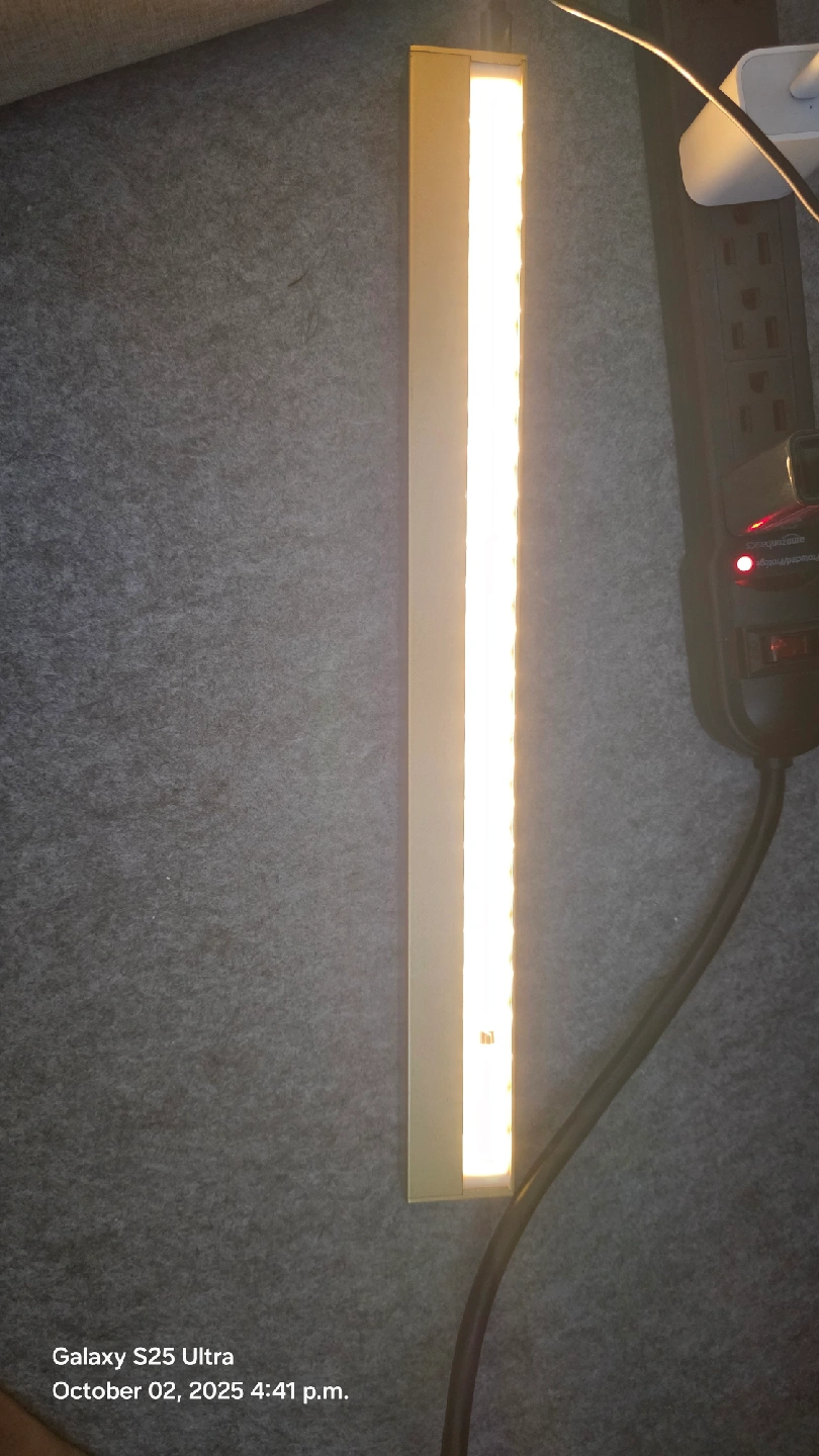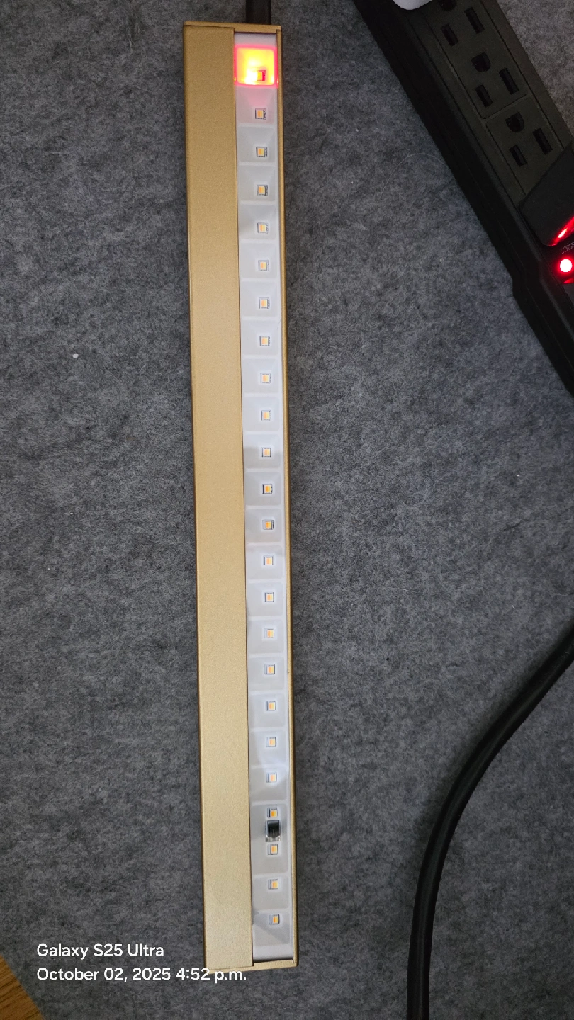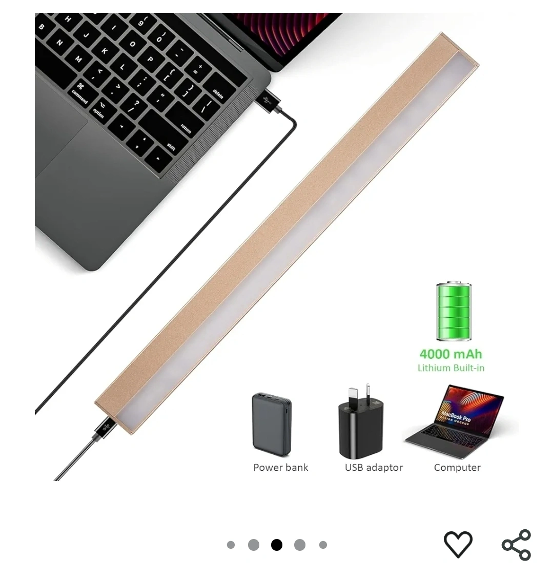 This is a portable LED light bar in gold! It has a built-in 4000 mAh lithium battery, so it's lightweight and easy to move around. It comes with a USB charging cable. 3 light shades as in the pictures touch button magnets to attach it to metal
