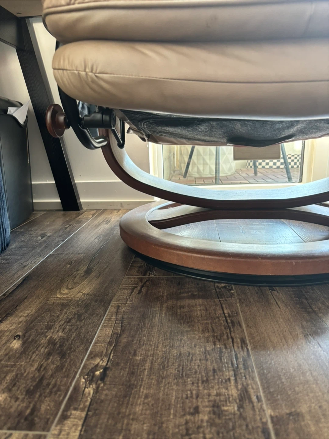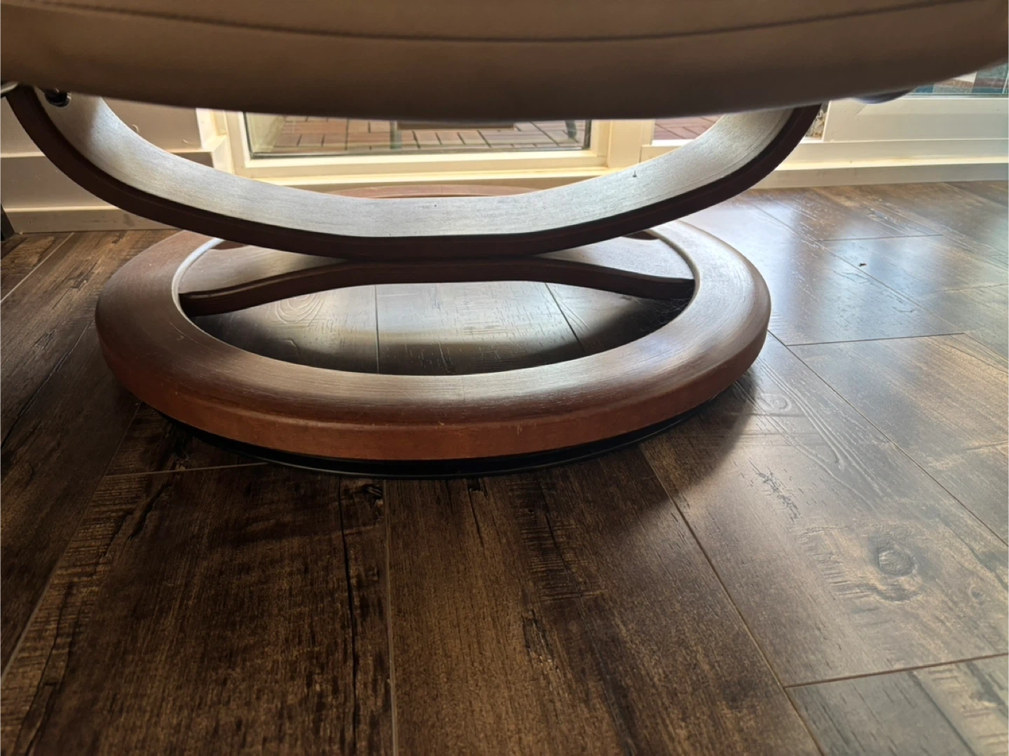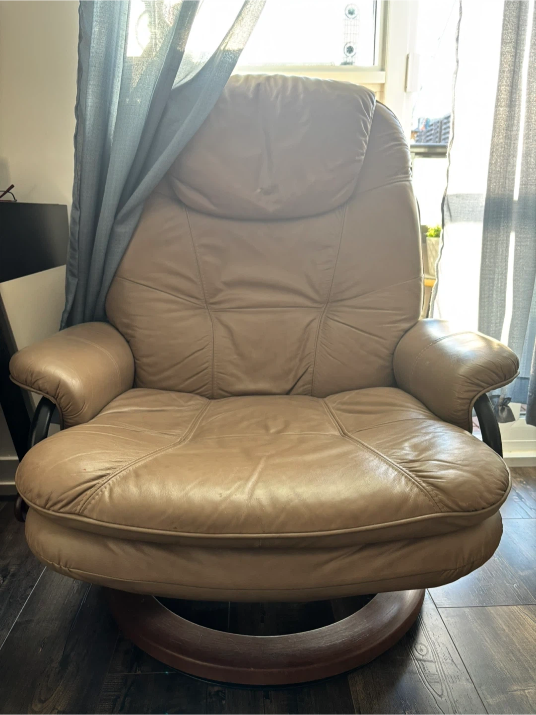 Selling a Drake recliner chair in a hazelnut leather finish. It's a comfortable and stylish addition to any living space! The chair has a wood base. It's in good condition and ready for a new home. Purchased from The Brick. Pick up at Main and Danforth.