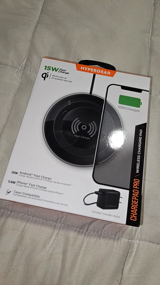 Selling a brand new Hypergear Chargerpad Pro Wireless Charging Pad! It's a 15W fast charge pad that works with all Qi-enabled devices. It's case-compatible and has a quiet operation. It charges Android and iPhones. Includes fast charge wall adapter and USB-C cable