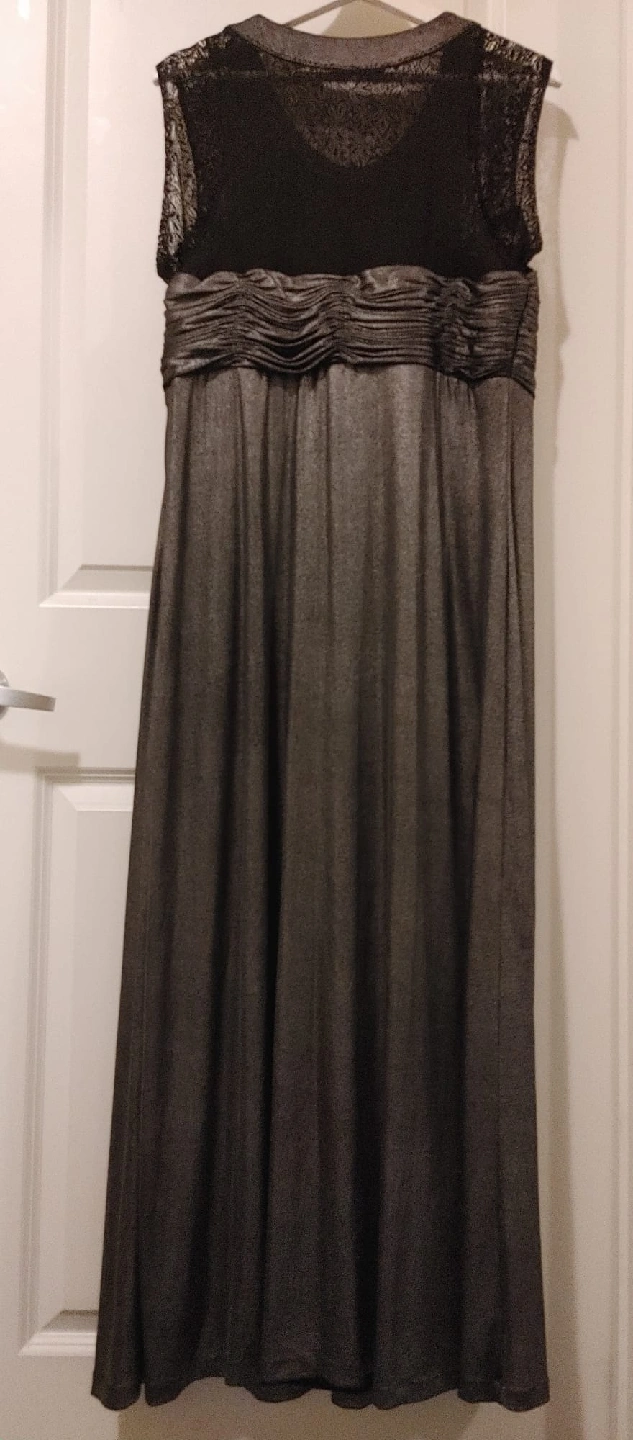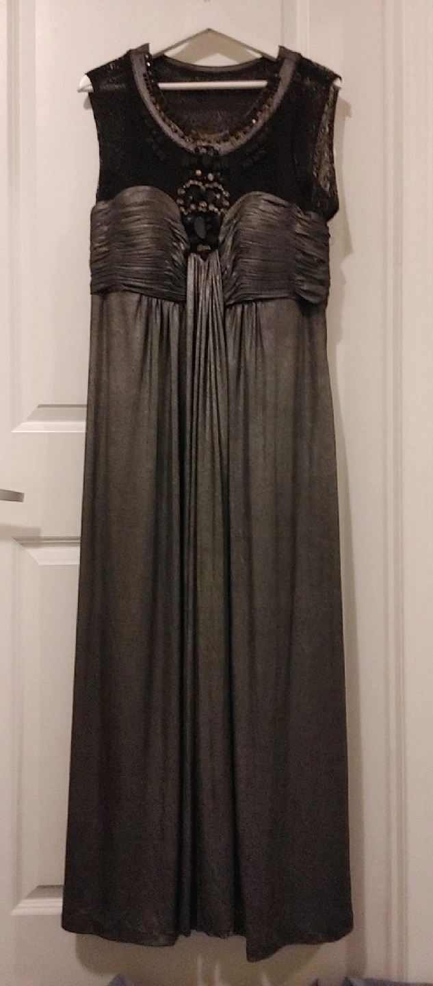 Selling a beautiful evening dress, perfect for a special occasion! It features a black lace top with intricate beaded detailing around the neckline. The bottom is a flowing silver fabric that drapes nicely. used only once.
