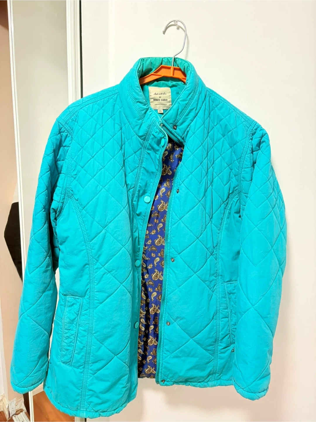 Selling a Monte Carlo quilted jacket in size 3XL. It's a lovely teal colour with a unique paisley lining. Perfect for adding a pop of colour to your wardrobe!