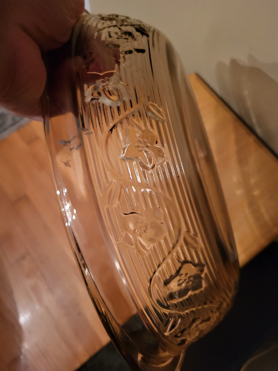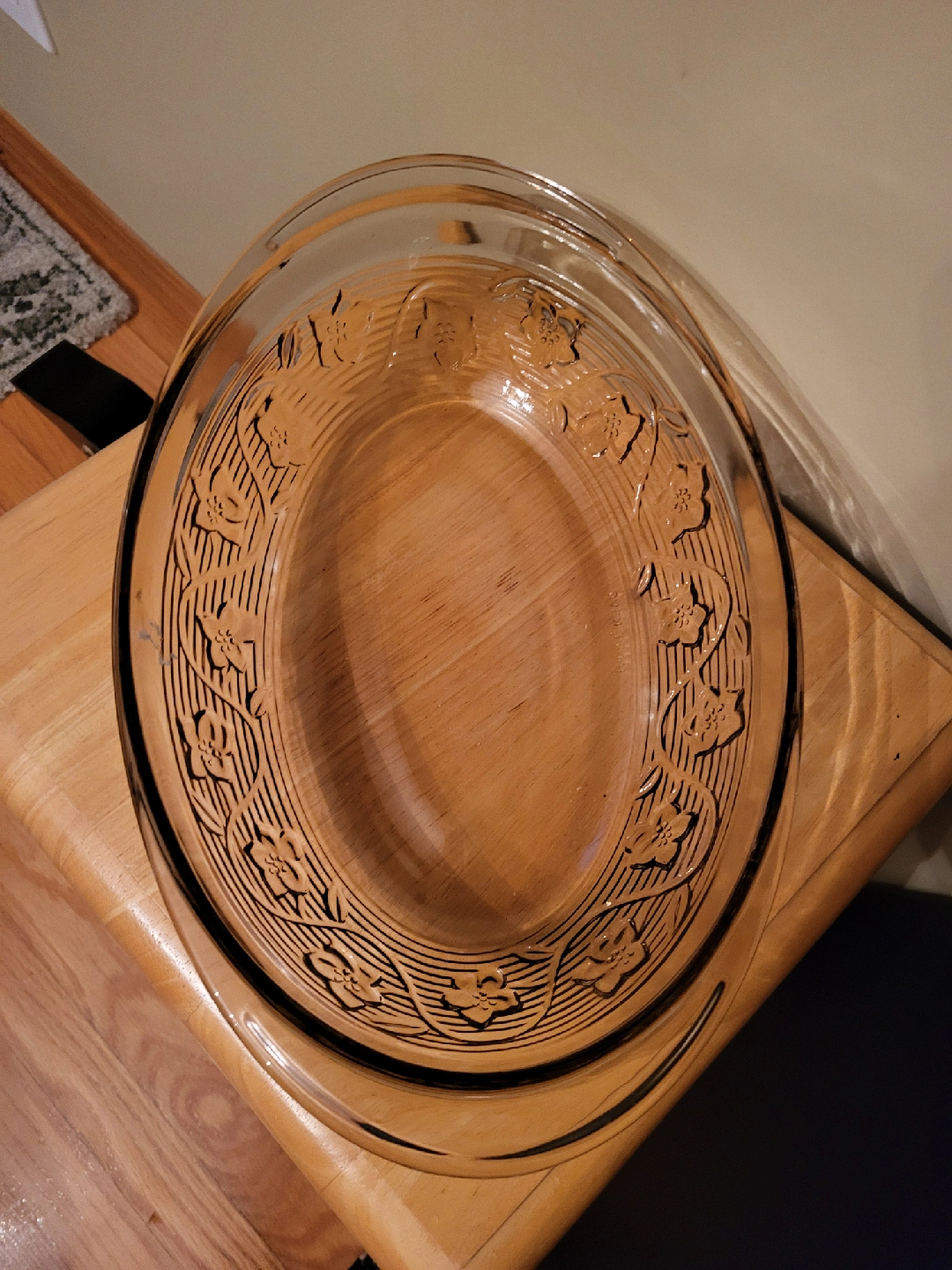 Selling a purple tinted glass oval baking dish. It has a pretty floral design around the rim. Perfect for baking and serving your favourite dishes! 13" l x 8" wide x 3" high