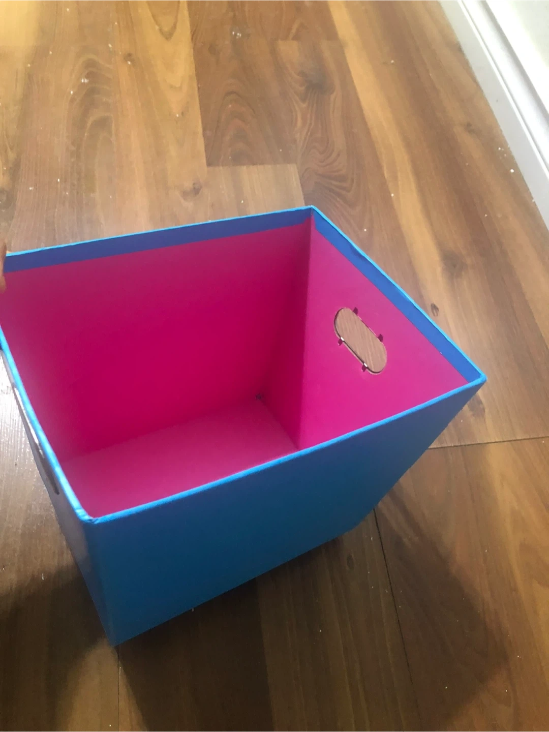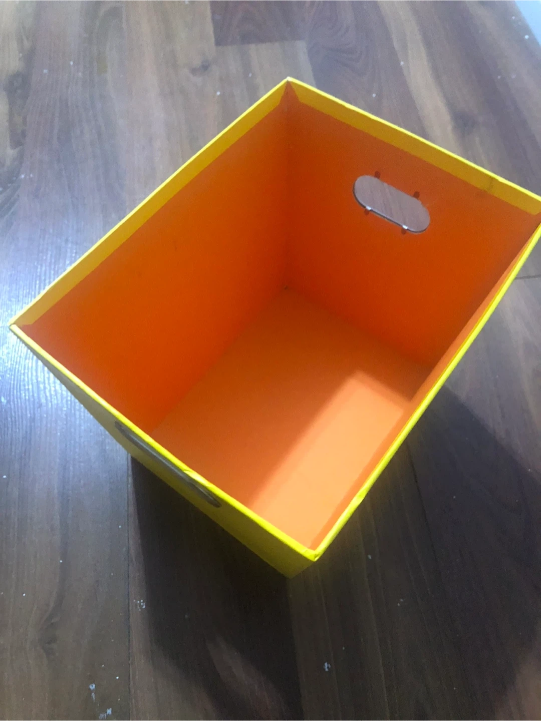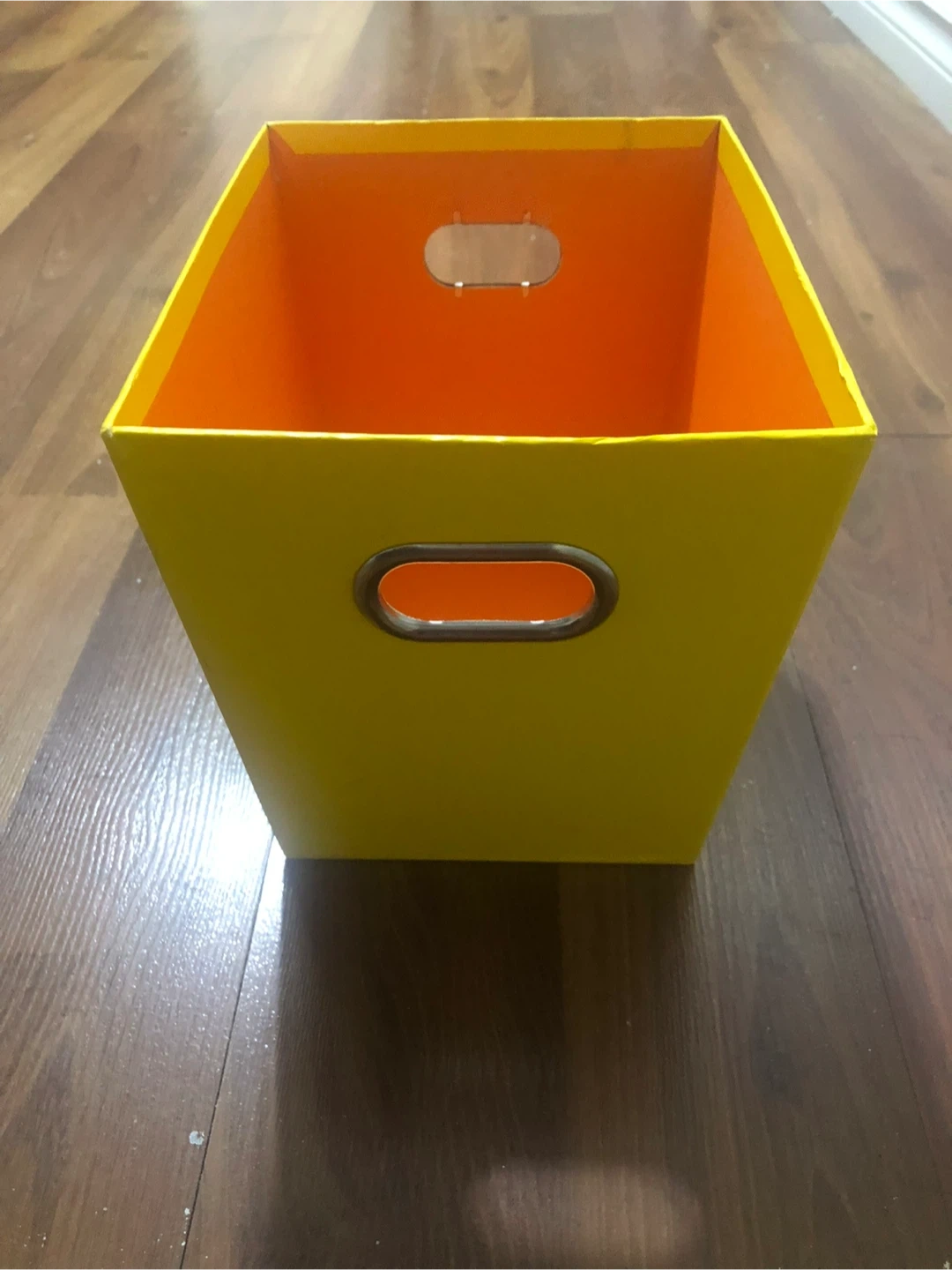 A colourful storage box, perfect for organizing your space. It's yellow on the outside with an orange interior. There are also some blue and pink ones if you're interested!