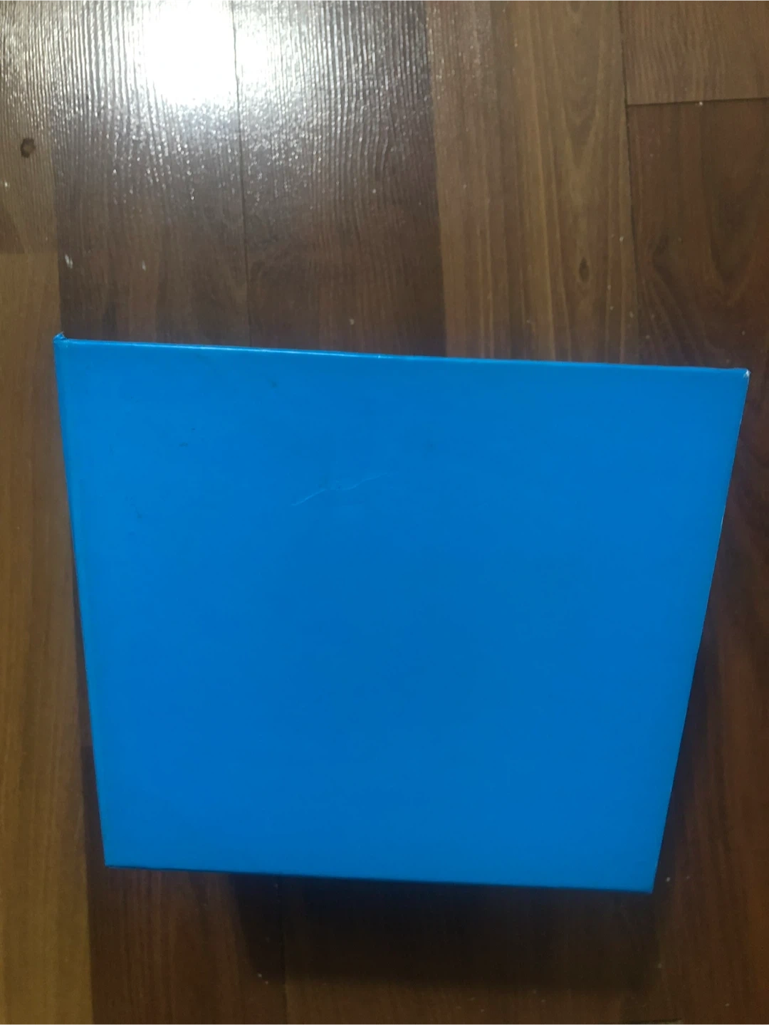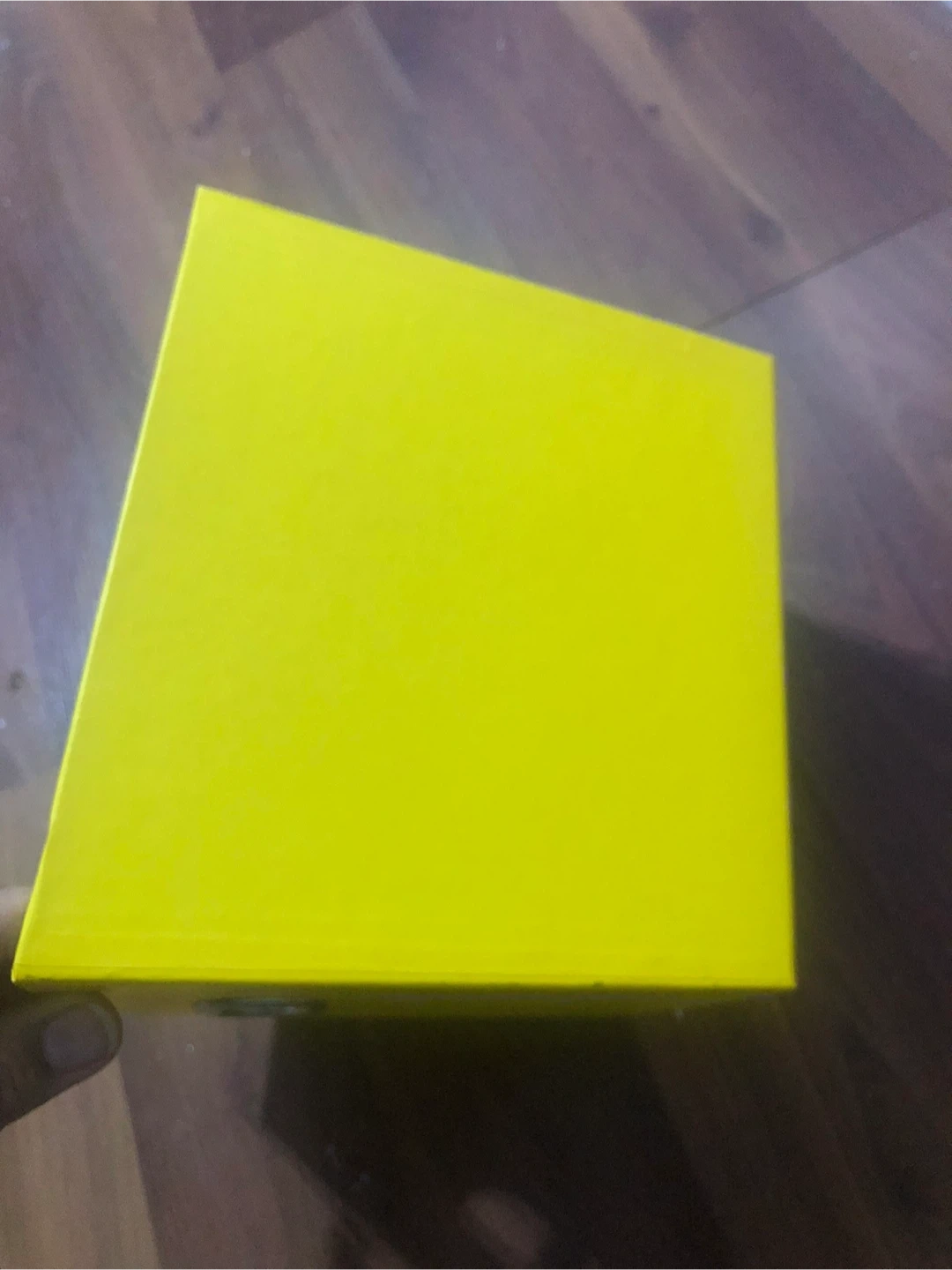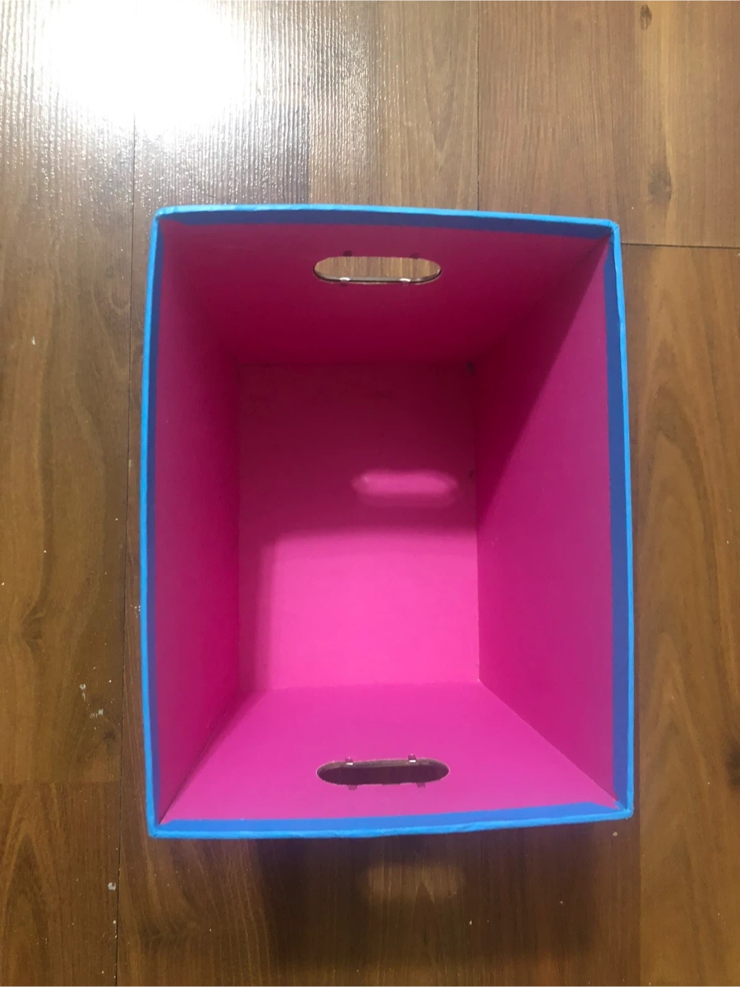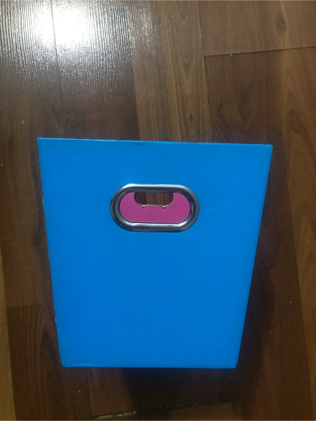 A colourful storage box, perfect for organizing your space. It's yellow on the outside with an orange interior. There are also some blue and pink ones if you're interested!