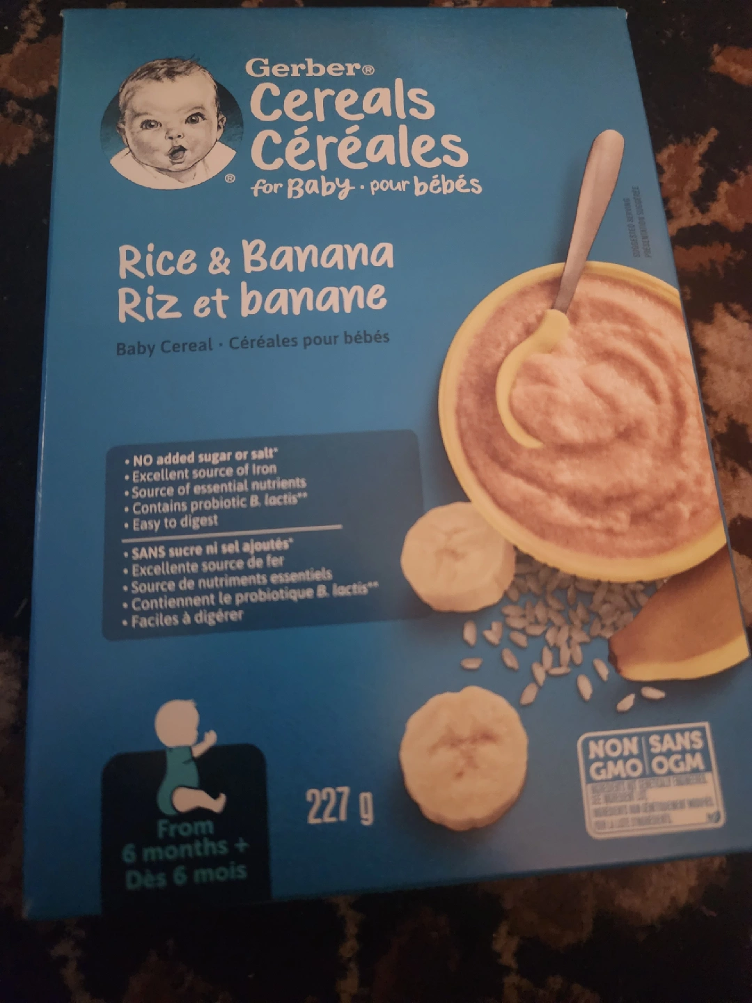 Selling a box of Gerber Rice & Banana baby cereal, perfect for little ones from 6 months and up. It's an excellent source of iron and essential nutrients, plus it contains probiotic B. lactis. Easy to digest and has no added sugar or salt. Net weight 227g