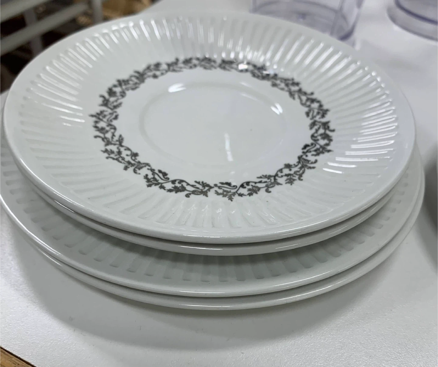 Selling a set of four white saucers. They have a nice ribbed design and a decorative floral pattern around the centre. They're in great shape and ready for a new home