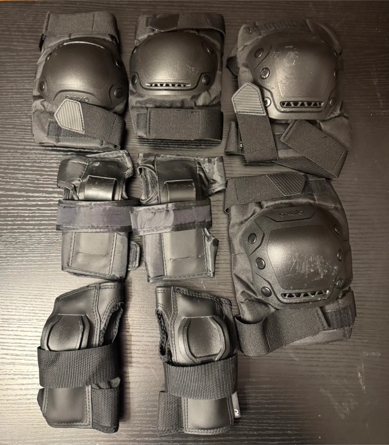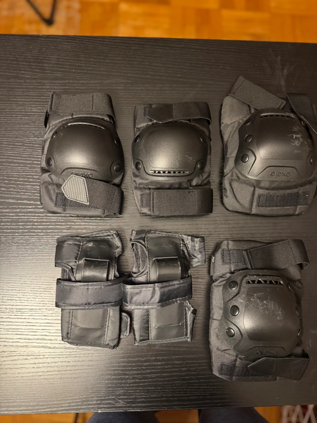 Selling a complete set of Oxelo protective gear, including knee pads, elbow pads, and 4 wrist guards Great for skateboarding, rollerblading, or any other activity where you need some extra protection All pieces are in good used condition and ready to go