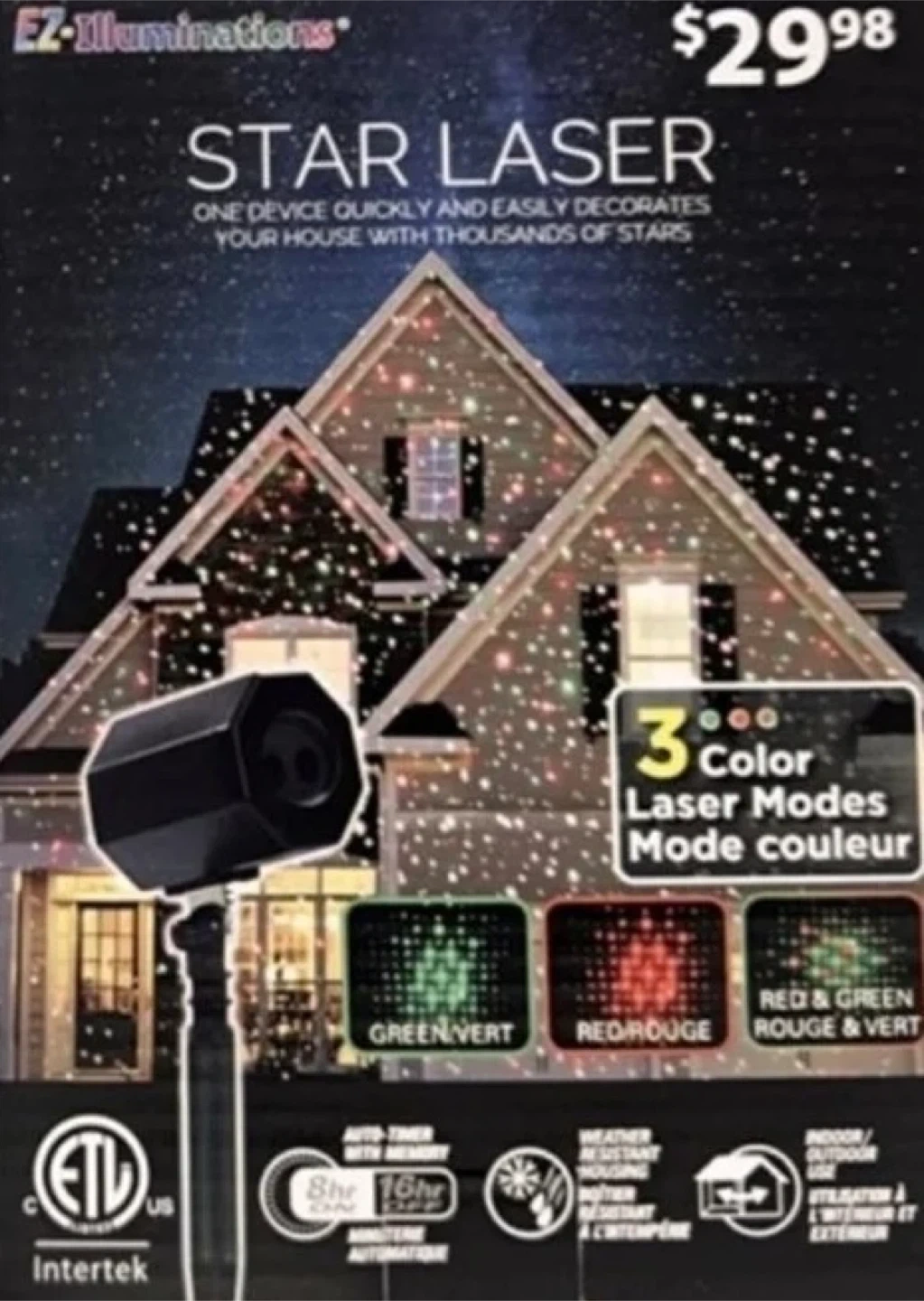 Decorate your house quickly and easily with thousands of stars using this EZ-Illuminations Star Laser light! It has 3 color laser modes and is weather resistant for indoor/outdoor use. Originally bought for $29.98