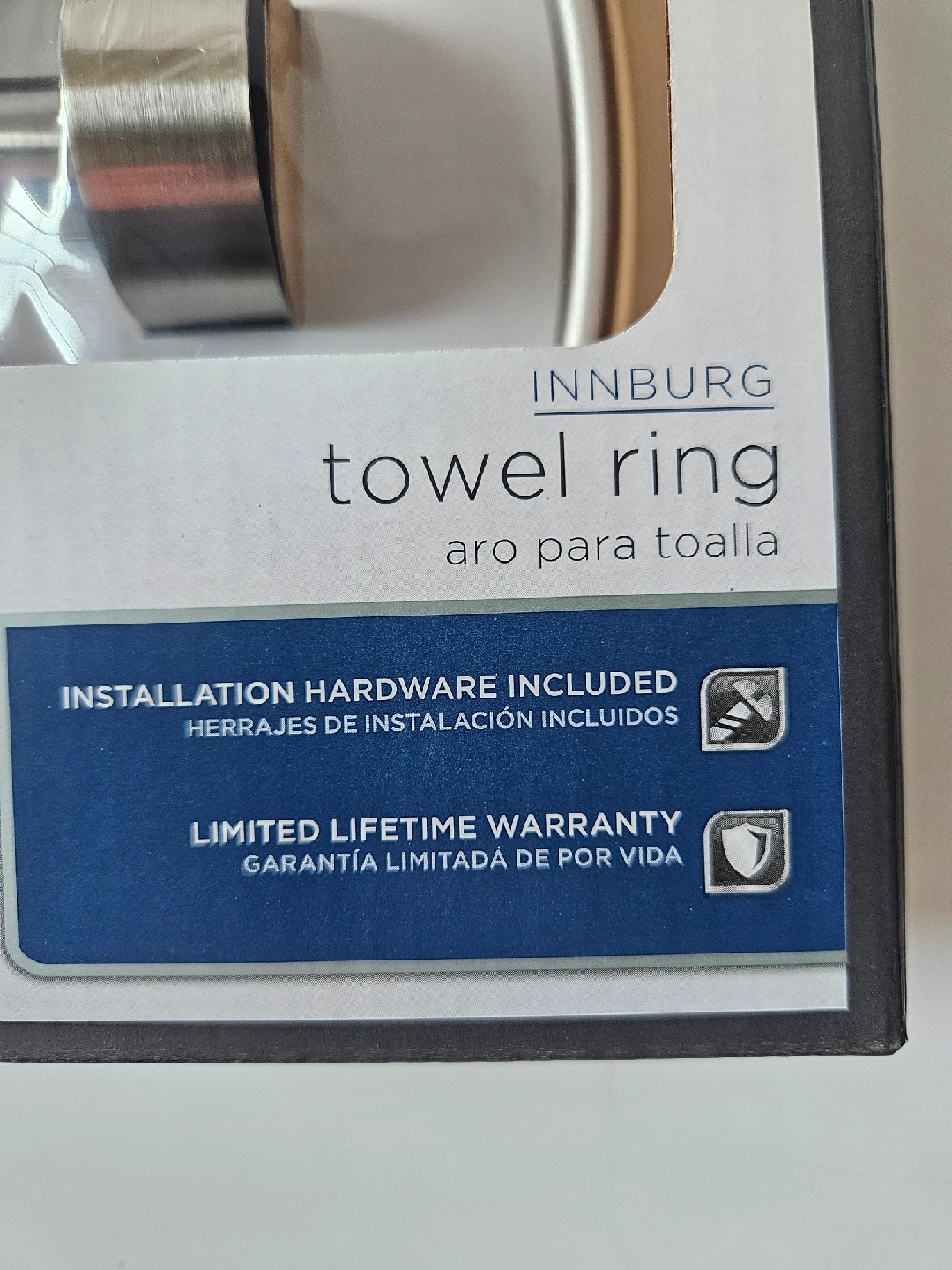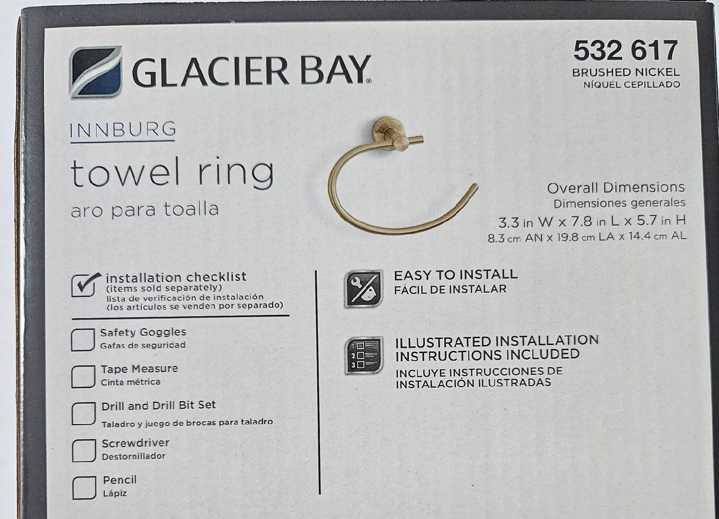 Selling a Glacier Bay Innnburg towel ring in brushed nickel! It's new and comes with installation hardware and illustrated instructions. The overall dimensions are 3.3 inches in width, 7.8 inches in length, and 5.7 inches in height. Easy to install and adds a nice touch to any bathroom!