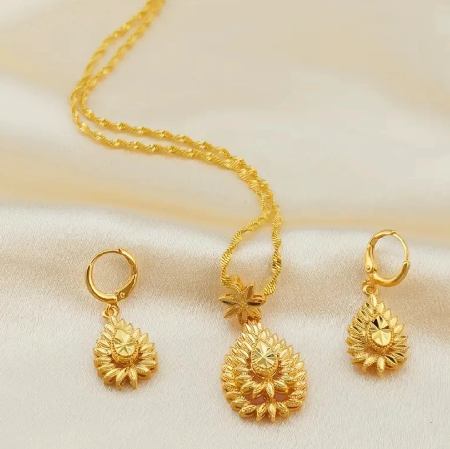 Selling a lovely gold-toned necklace and earring set. The set features a sunflower-inspired design. Perfect for adding a touch of elegance to any outfit!