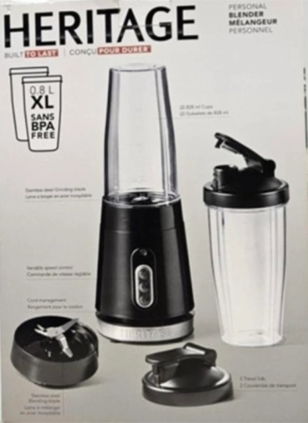 Selling a brand new Heritage personal blender in excellent condition! It comes with a specially designed blade to crush ice. The blender includes 2 travel lids and a stainless steel grinding blade. It's 0.8L and BPA free