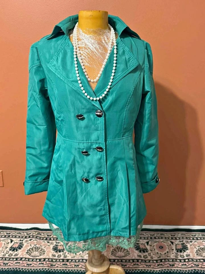 Turn heads with this unique and elegant teal trench coat, featuring stunning details that elevate your cold-weather style: Pearl necklace available for an extra $5 โจ Features: Beautiful lace peekaboo hemline for a feminine touch Double-breasted design with decorative black buttons Chic back bow adds a classy finish Structured fit with flattering seams Size M โ fits true to size Brand new with tag (GBOFUSHI brand) Perfect for layering over dresses or styling with boots for fall ๐ ๐ Pickup in Mission, near Centennial Park